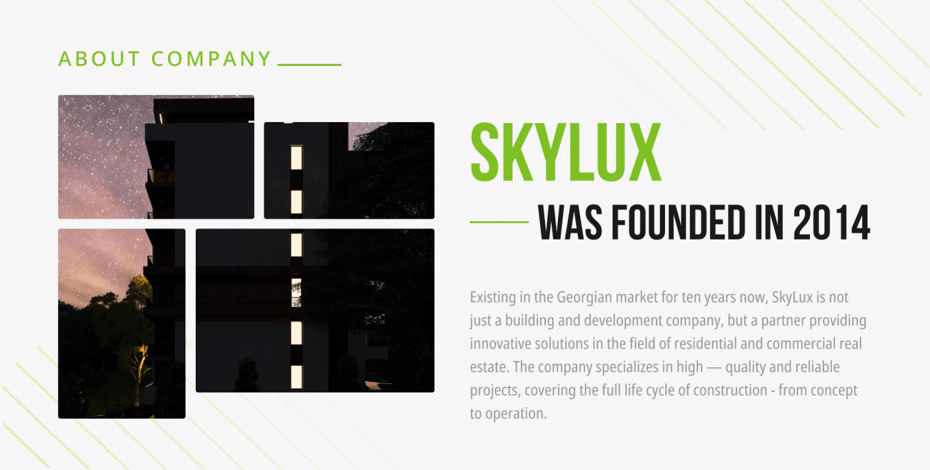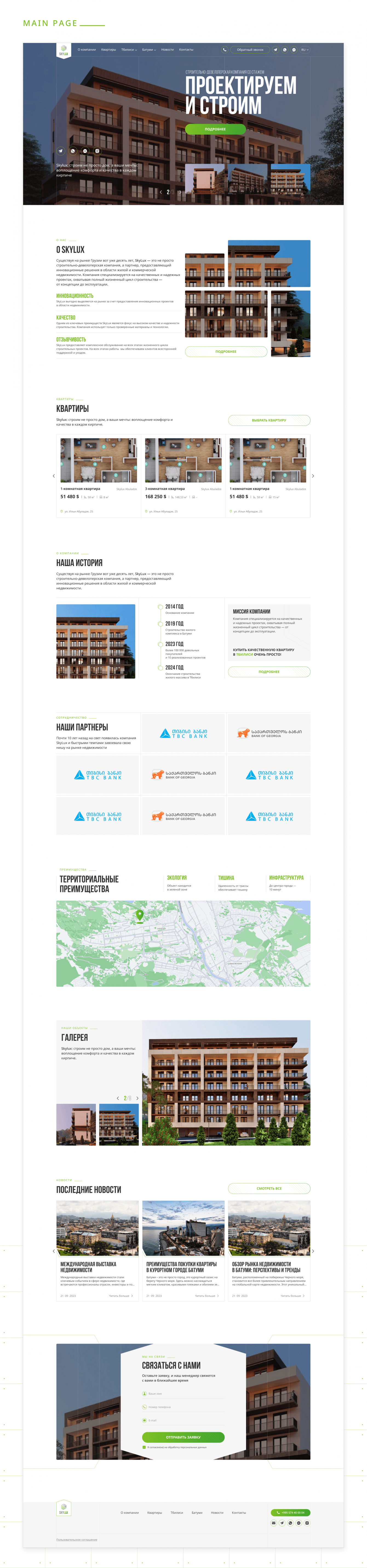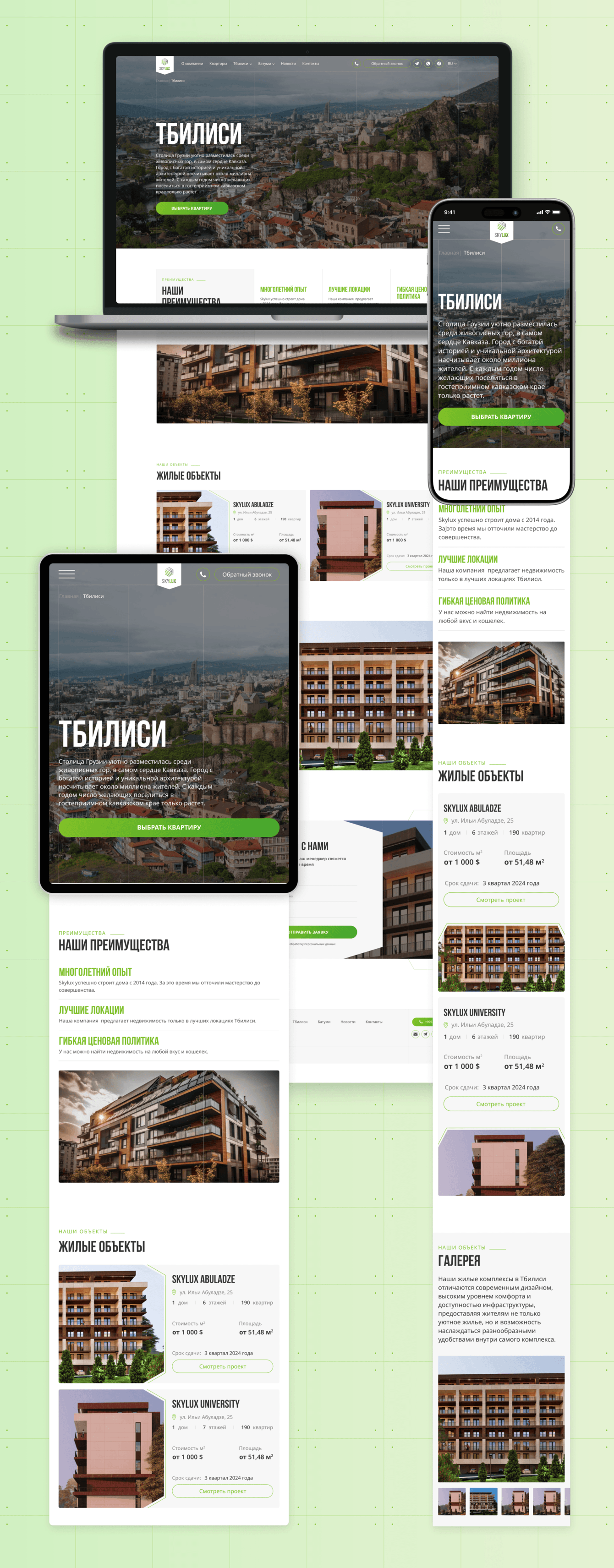 Создать корпоративный сайт для застройщика SkyLux, работающего на грузинском рынке уже десять лет. Сайт должен подчеркнуть профессионализм и качество услуг компании, а также представить портфолио проектов, описать опыт и специализацию.