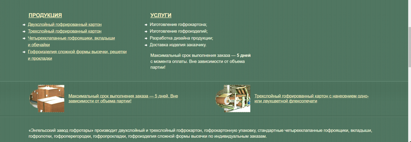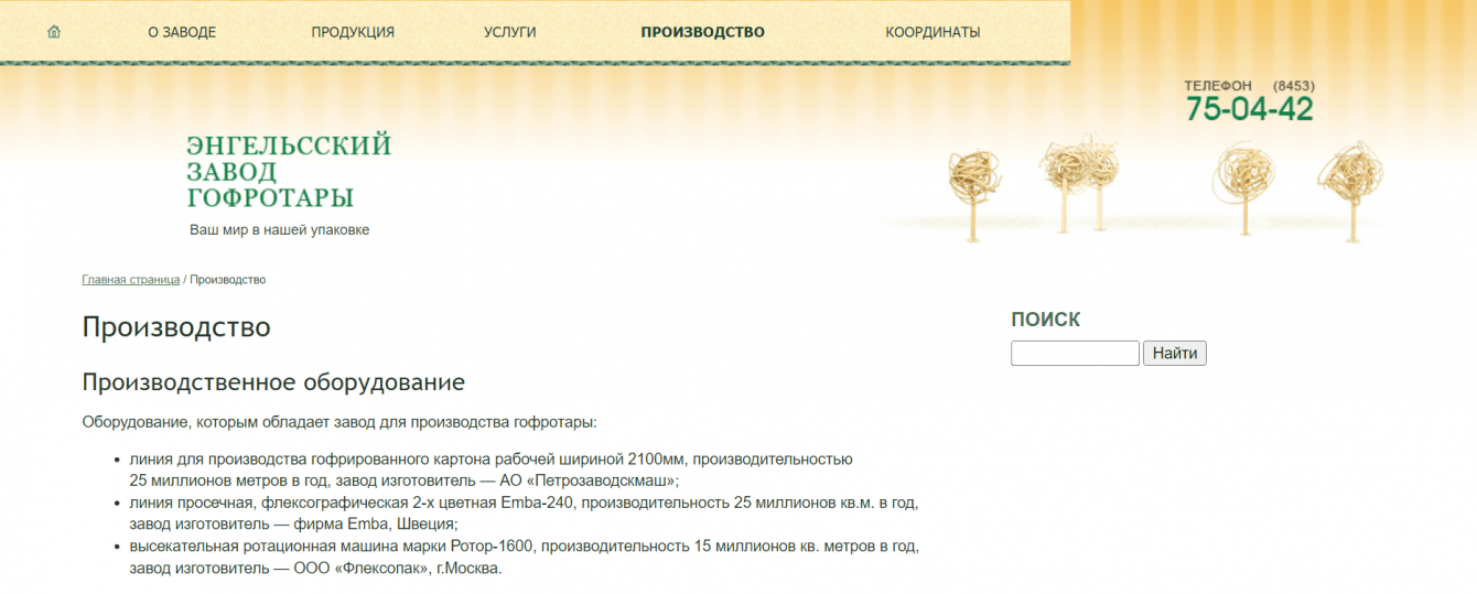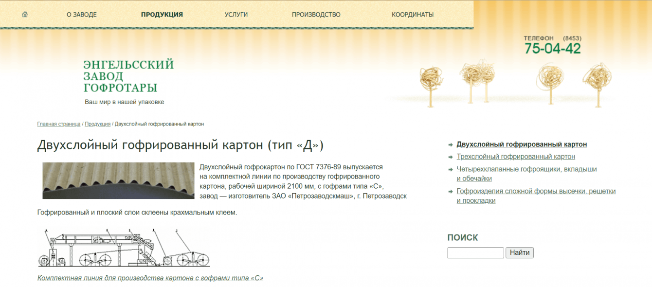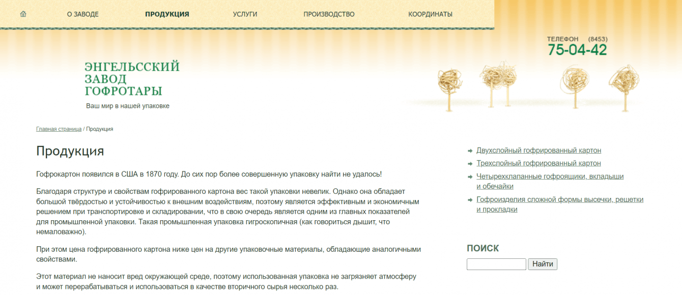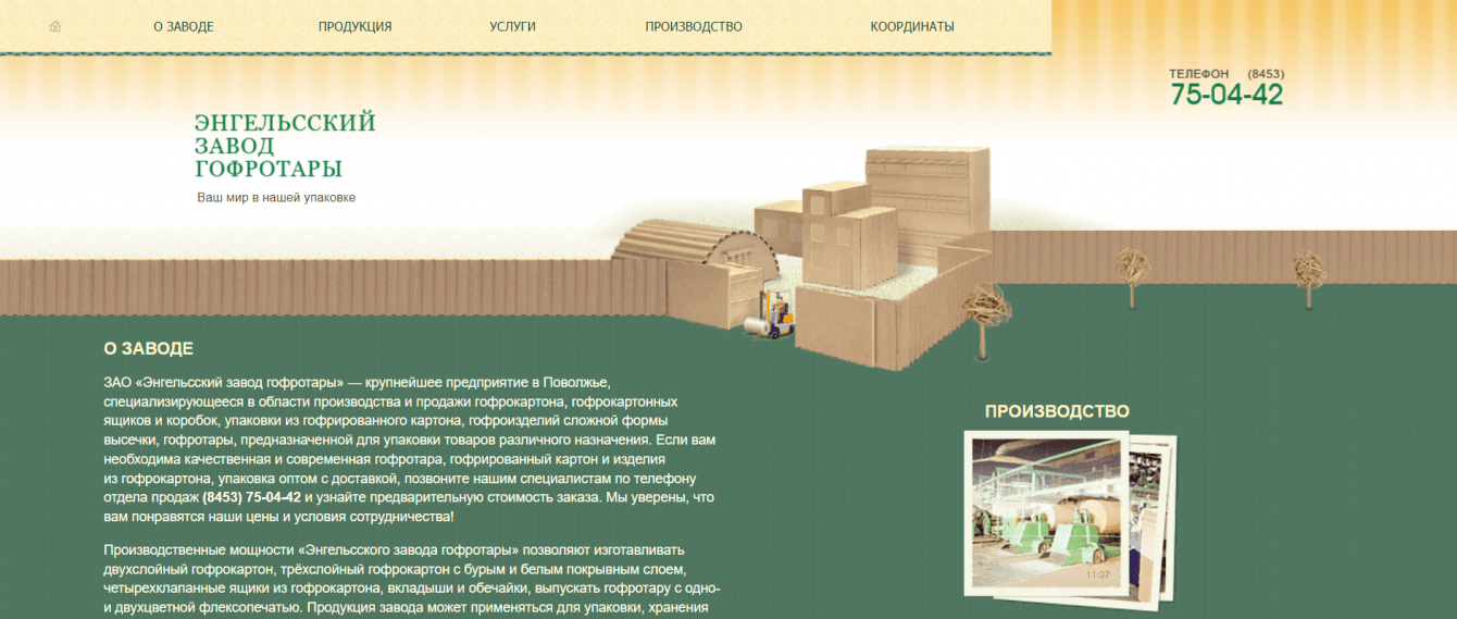 Разработать корпоративный сайт для завода, выпускающего гофрокартон, гофрокартонные ящики и коробки, упаковку из гофрированного картона, гофроизделия сложной формы высечки, гофротару различного назначения. Оптимизировать готовый сайт и продвинуть в поисковых системах по России. Настроить и модерировать кампанию в Яндекс.Директе.