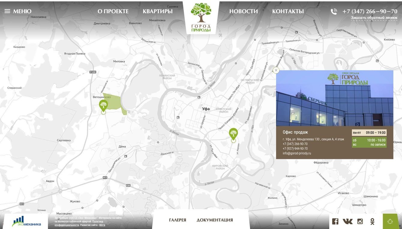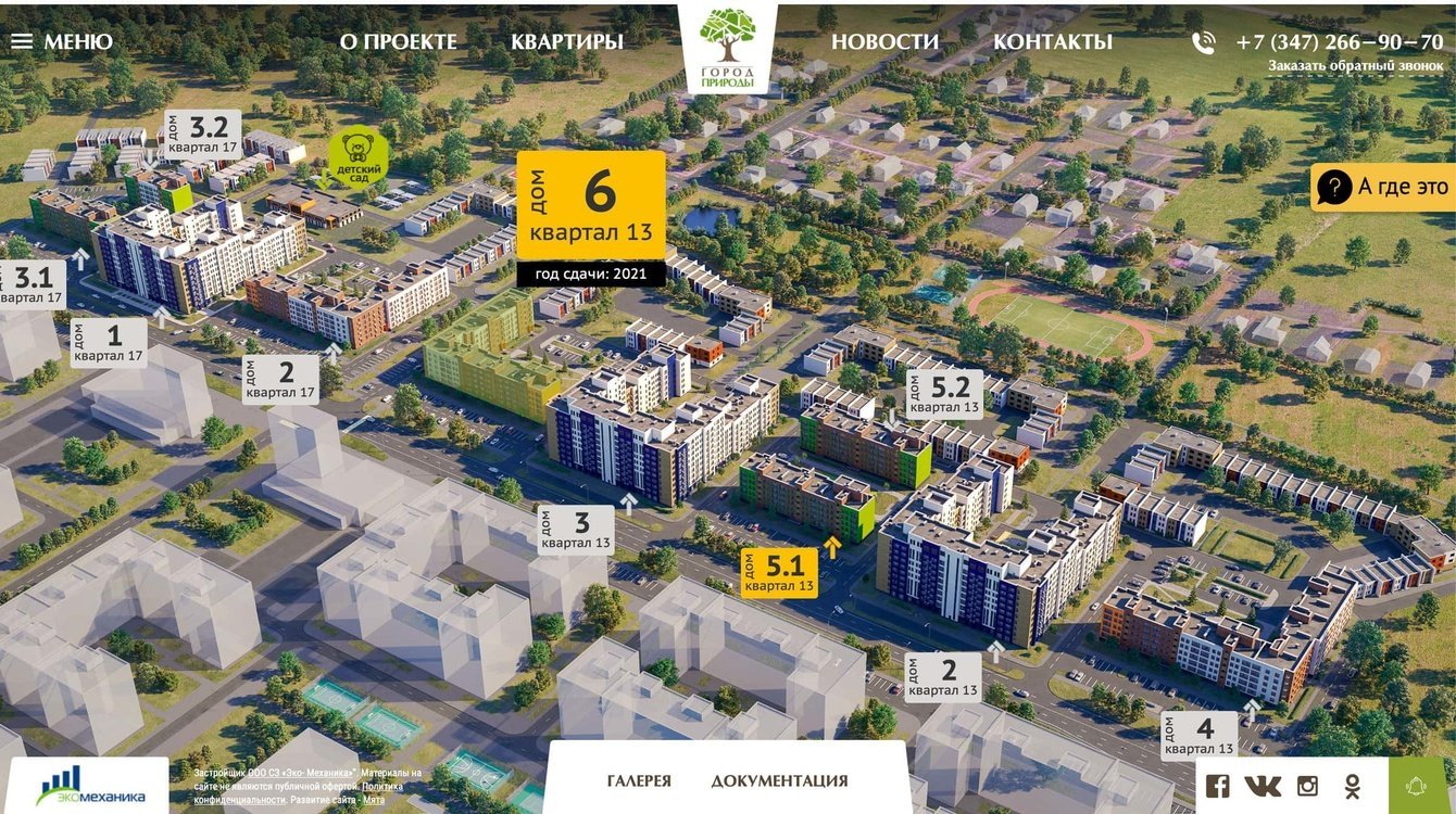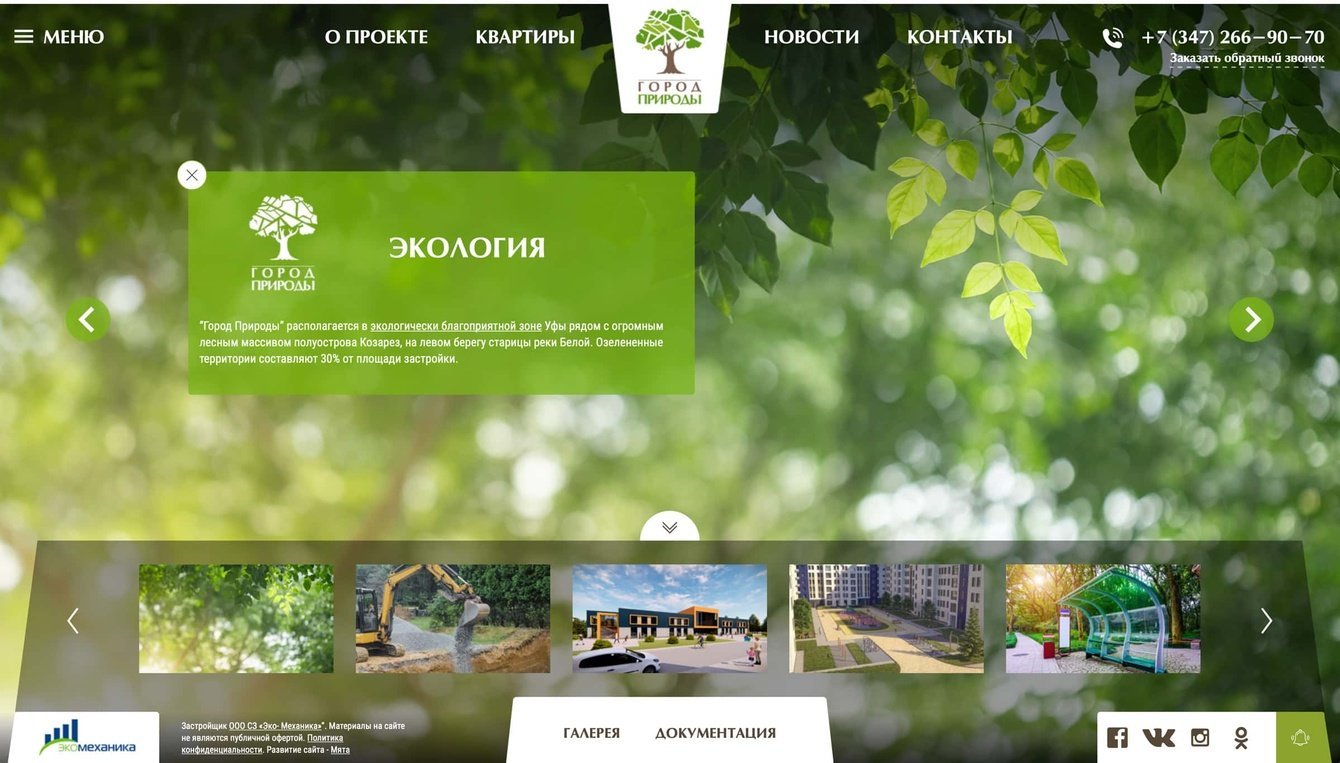 «Город природы» - крупнейший в Уфе градостроительный проект комплексного развития территории в 8 км от центра города. Свободный от застройки новый район площадью 266 га располагается в экологически благоприятной природной зоне непосредственно на левом берегу старицы реки Белой.
