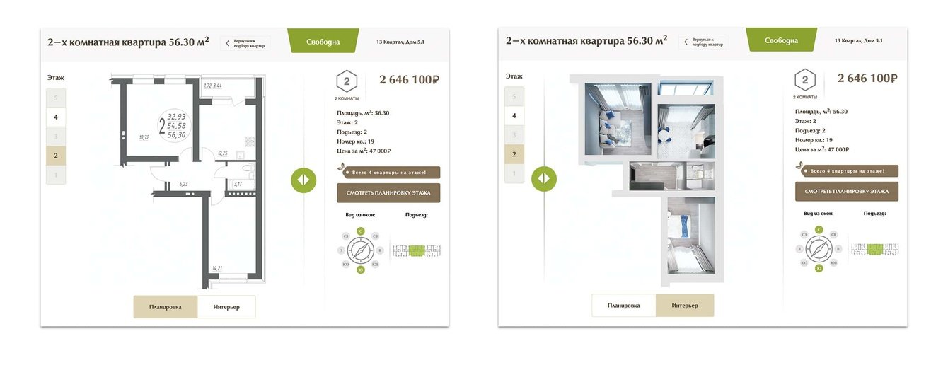 Планировка выбранного этажа дает пользователю всю информацию, которая необходима на этом шаге. Цветом обозначены статусы квартир. Есть возможность переключаться по этажам. Интегрирован генплан всего жилого комплекса с функцией перехода по подъездам.