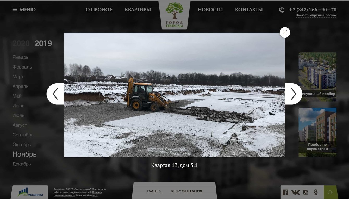Застройщик обязан публиковать фотографии, отражающие текущее состояние строительства. Чтобы это выглядело эстетично и удобно, мы проработали модуль хода строительства с возможностью фильтрации по годам и месяцам.
