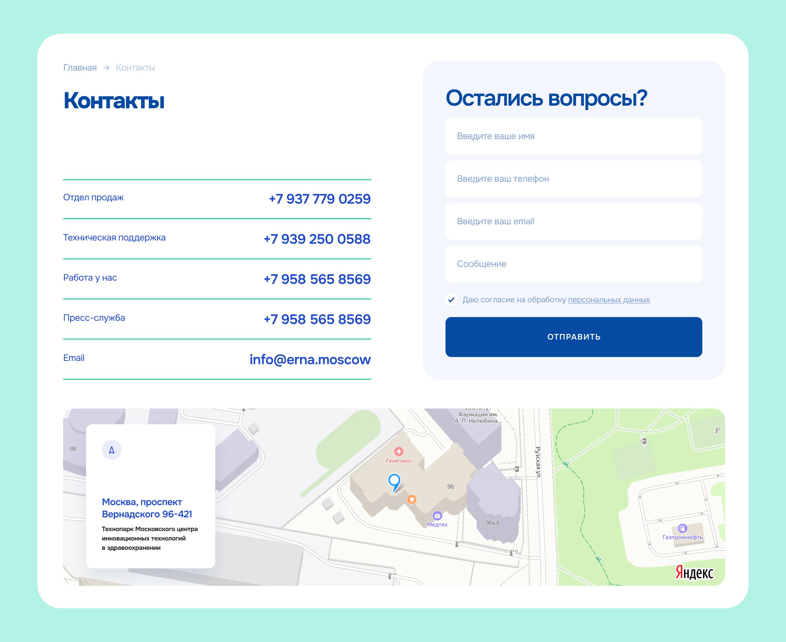Блок контактов. Связаться с Эрной можно в один клик — все номера телефонов, почта и адрес на карте кликабельны. Эта и многие другие приятные мелочи на сайте делают пользовательский опыт в разы лучше, чем на сайтах конкурентов. Интерфейс нового сайта отражает философию компании — заботу о людях.