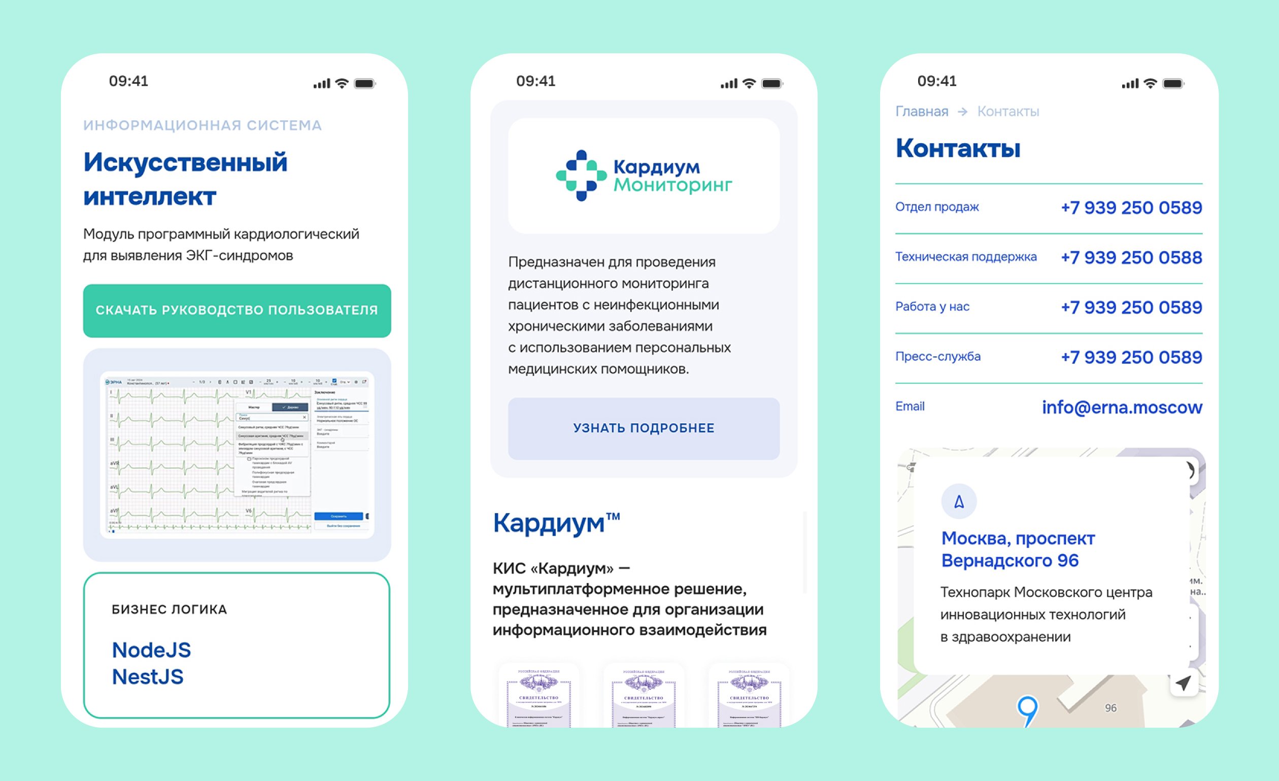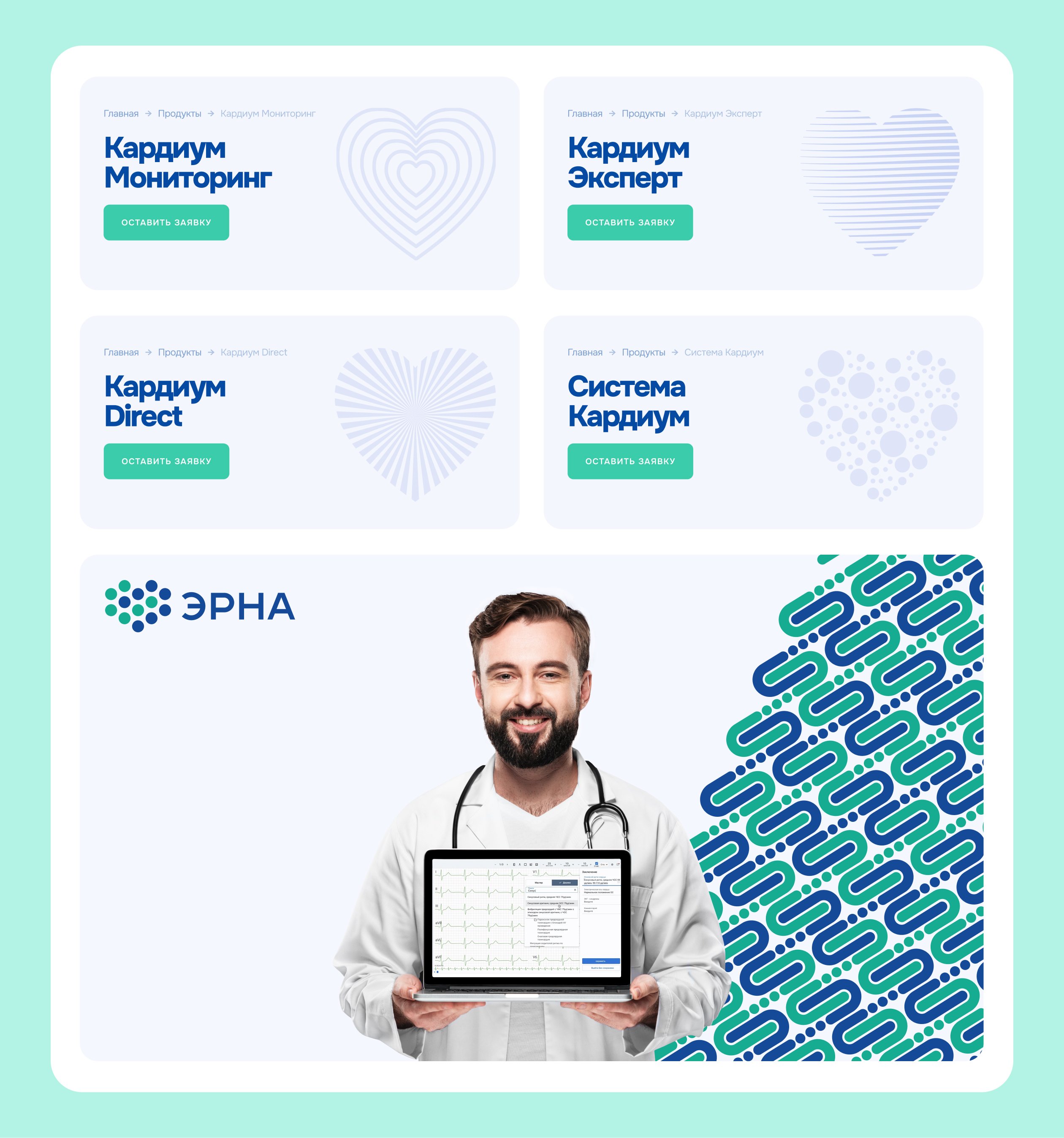 Мобильная версия. Адаптировали дизайн под мобильные устройства и отрисовали логотип для раздела «Кардиум Мониторинг» в фирменных цветах компании.