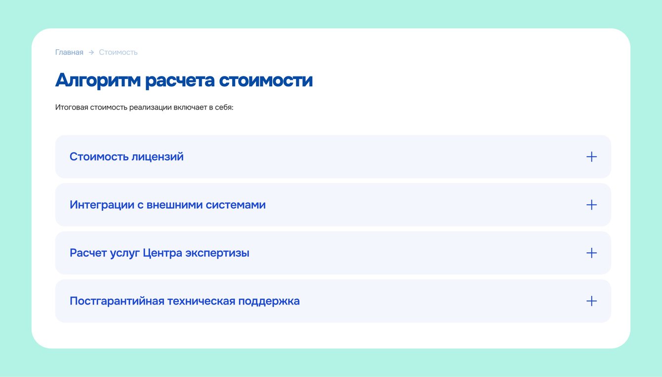 Стоимость продуктов. Еще одна страница на сайте — стоимость продуктов. Здесь тоже избежали сложных и длинных абзацев текста — разделили информацию на блоки, чтобы посетители сайта могли прочитать только то, что им нужно.