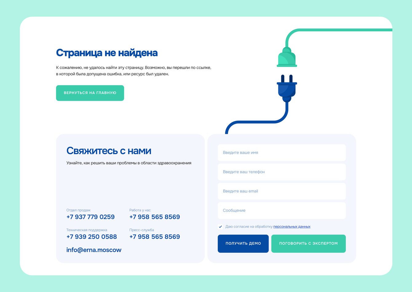 Потерянные страницы. Проверили, чтобы на сайте не осталось некорректных ссылок. А на случай, если такие появятся — задизайнили страницу «404» с формой для связи с менеджером.