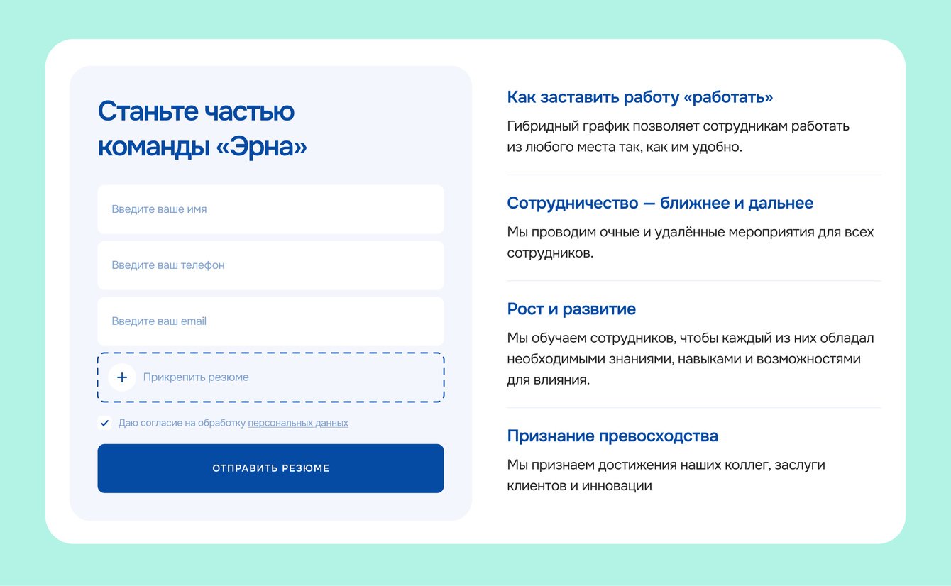 Эйчар бренд. Важным инсайтом на брифинге стало то, что Эрна всегда находится в поиске новых талантливых коллег. Добавили на сайт форму для отправки резюме, чтобы помочь потенциальным сотрудникам найти свое место в компании.