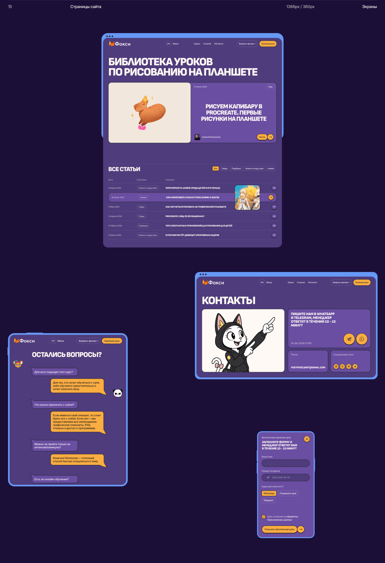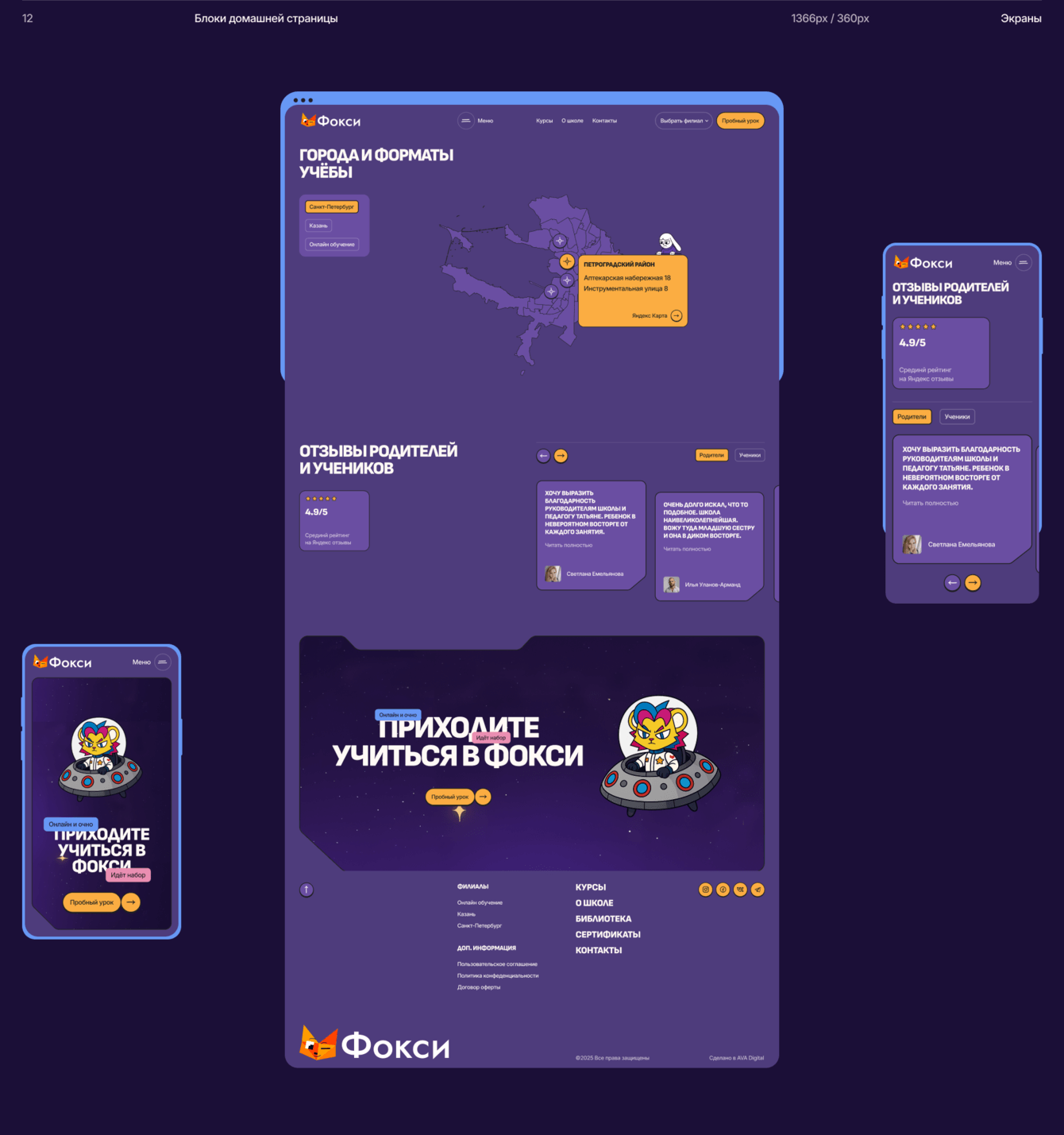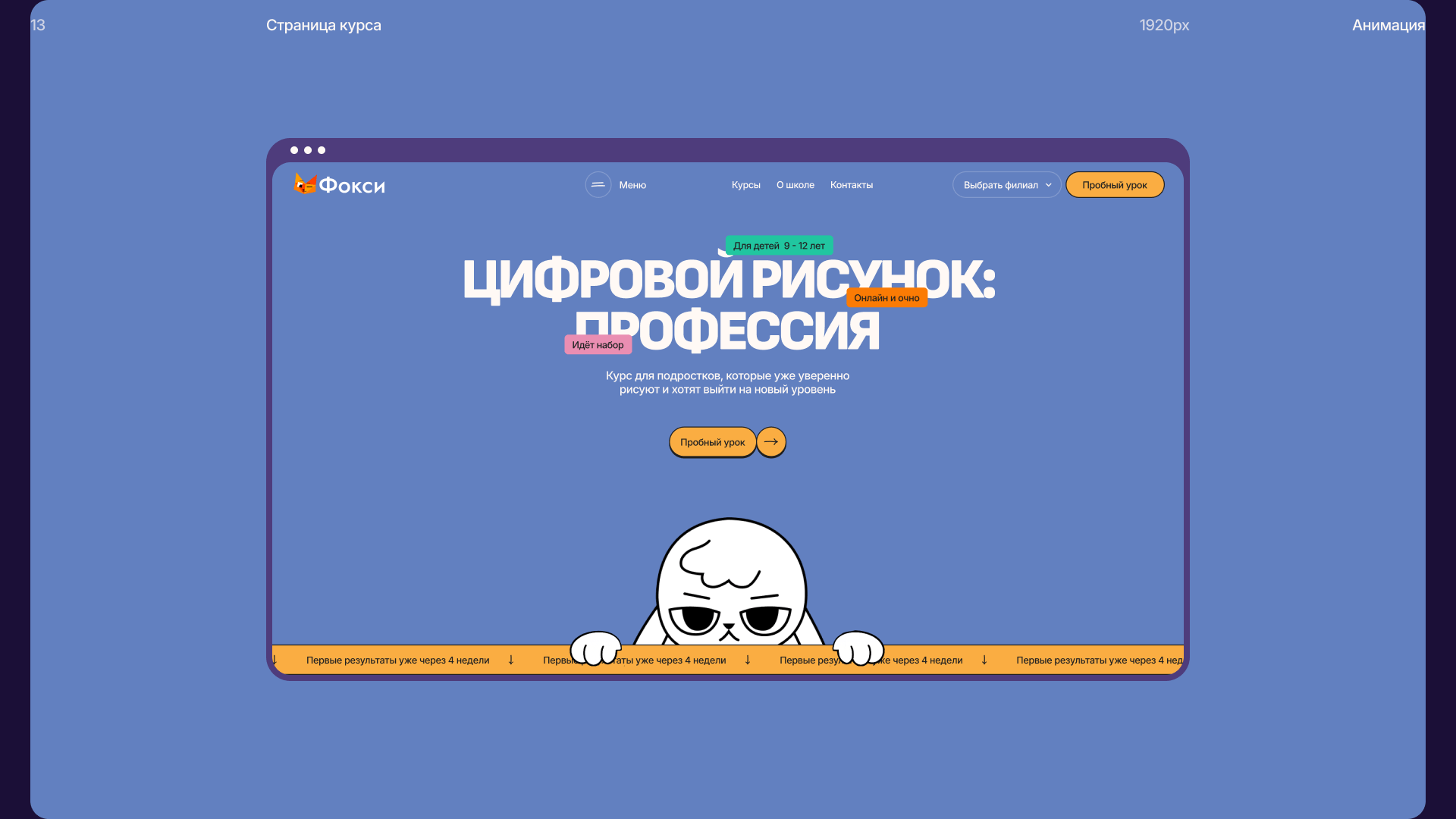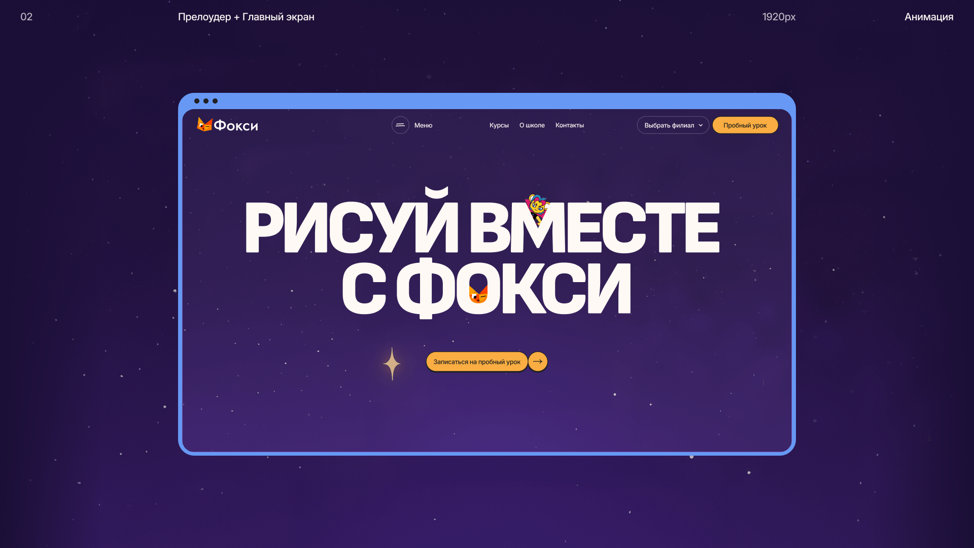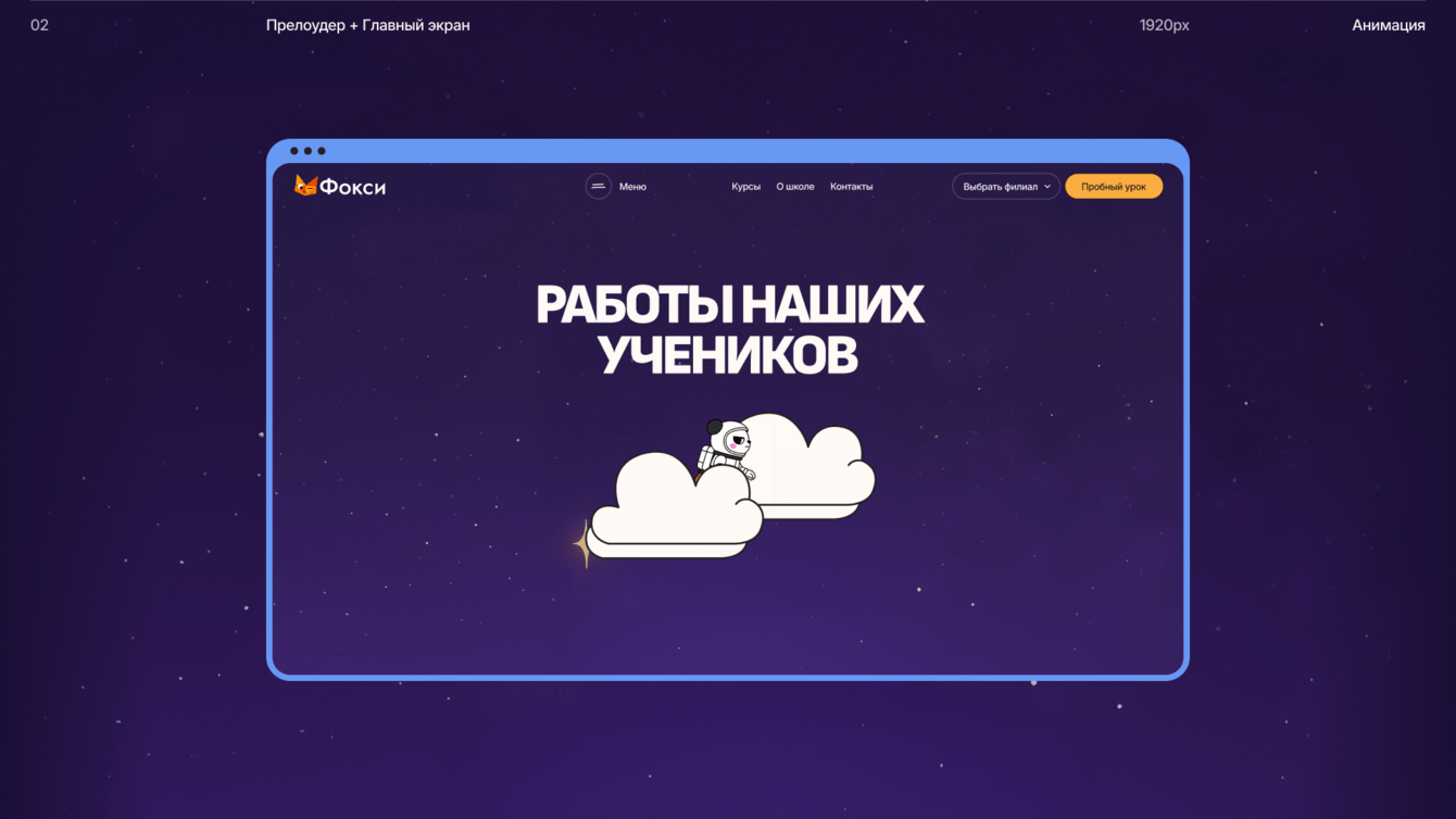 В основу дизайна легла идея «Вселенной Фокси» — творческого мира, где персонажи-животные помогают в обучении. У Foxy уже были маскоты: каждый отвечал за одно из направлений работы школы. Они использовались только в учебном процессе, а мы расширили их роль. Теперь это полноценные герои сайта, сопровождающие посетителя в каждом ключевом блоке.
