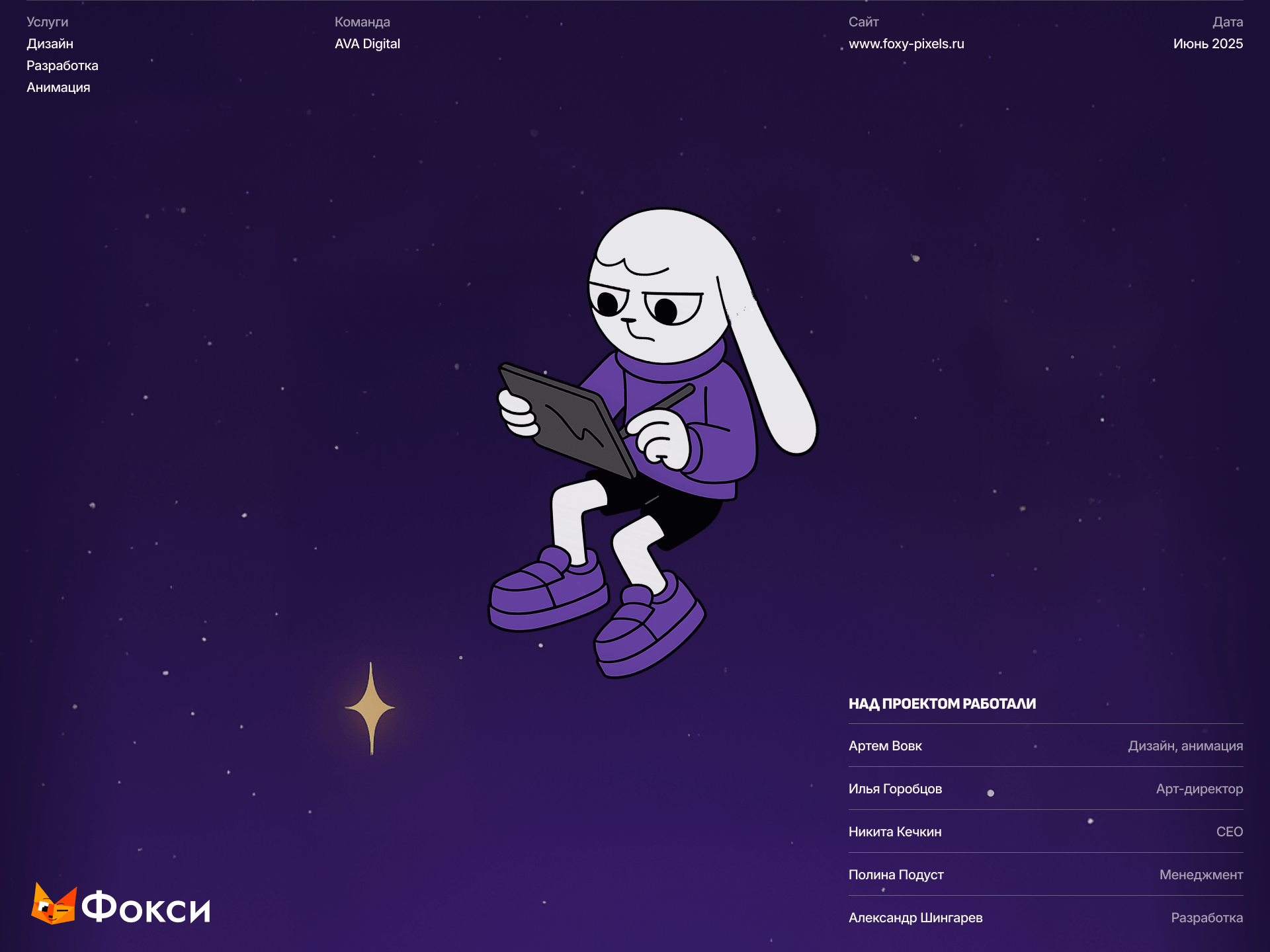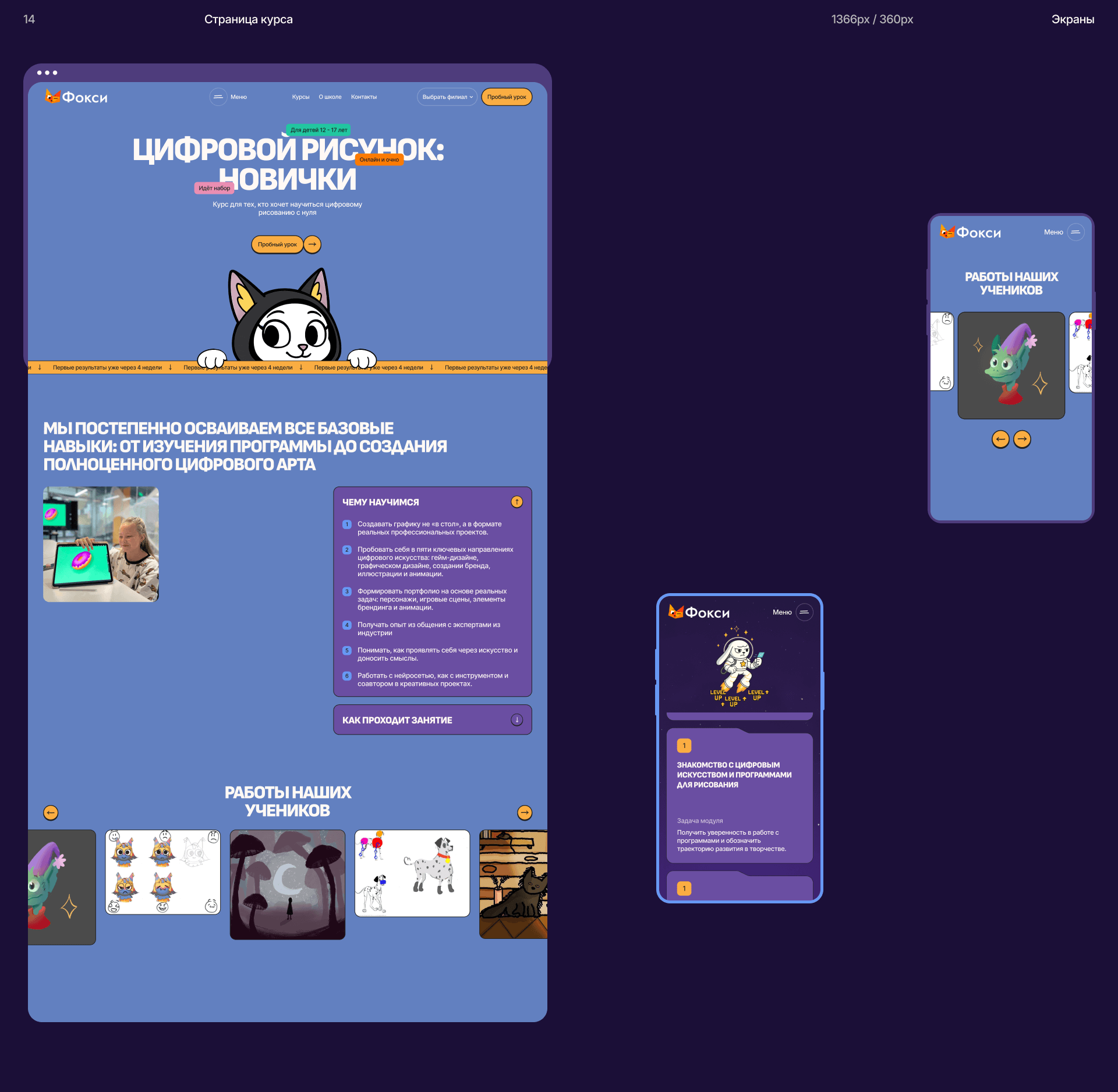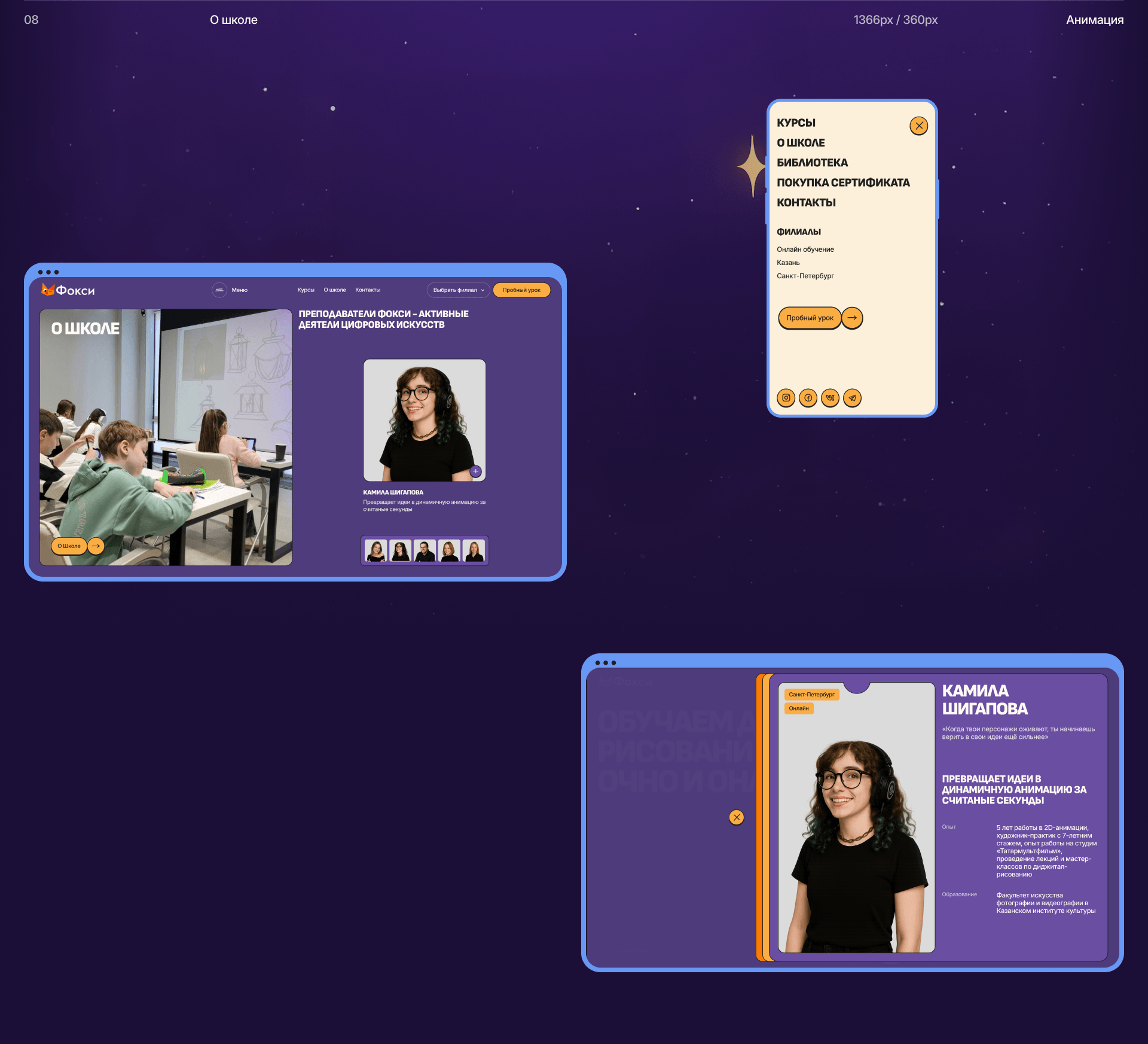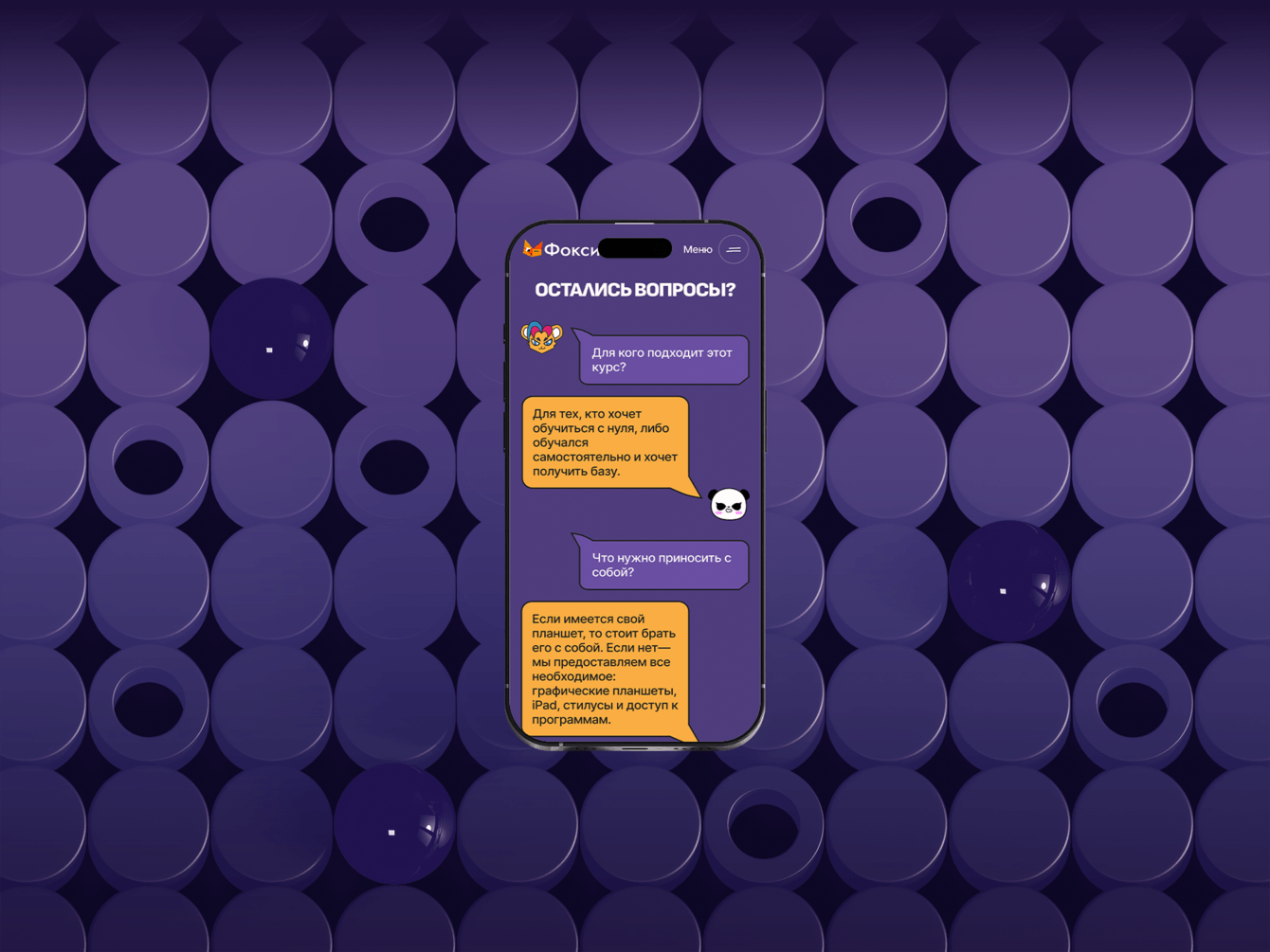 В основу дизайна легла идея «Вселенной Фокси» — творческого мира, где персонажи-животные помогают в обучении. У Foxy уже были маскоты: каждый отвечал за одно из направлений работы школы. Они использовались только в учебном процессе, а мы расширили их роль. Теперь это полноценные герои сайта, сопровождающие посетителя в каждом ключевом блоке.