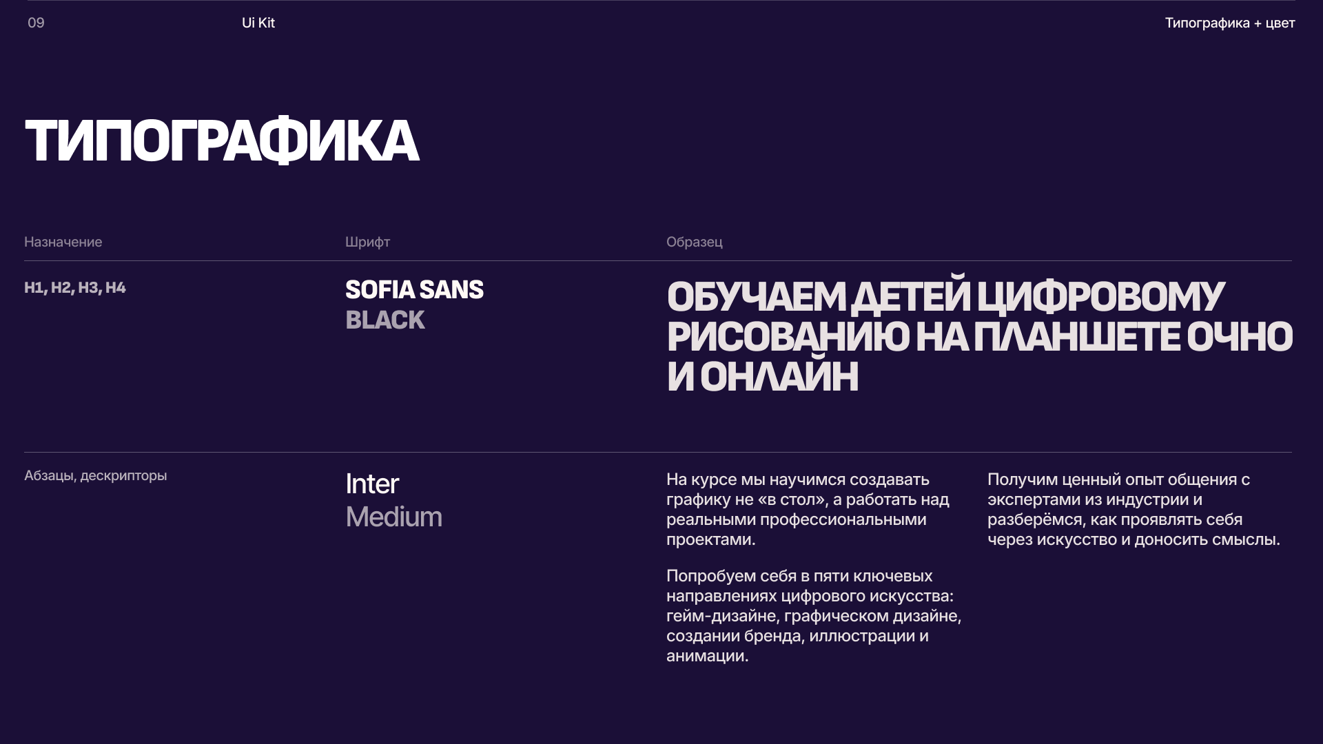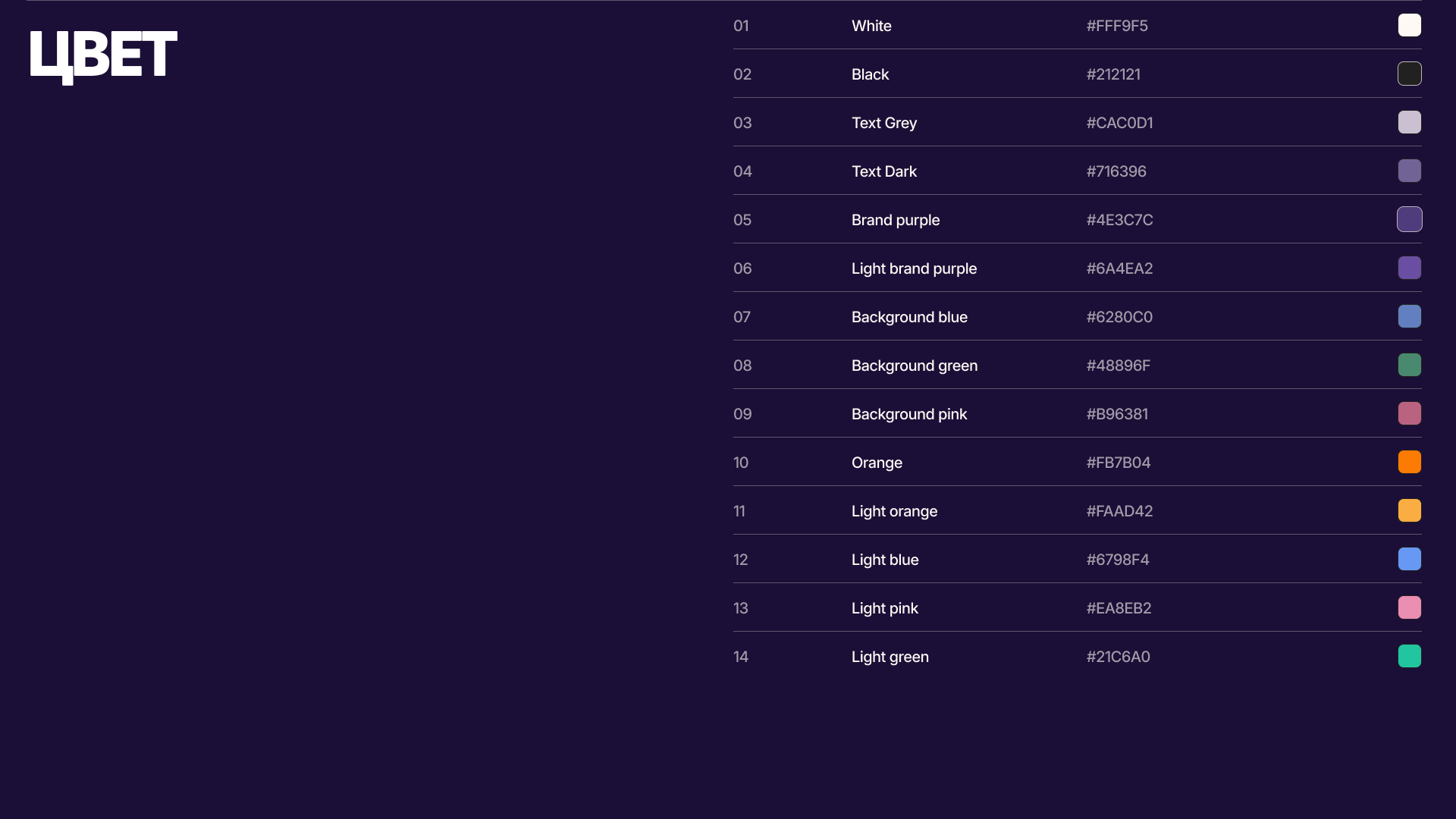 Обновили цветовую палитру: сохранили фирменные белый и оранжевый для текста и навигации, а для глубины добавили контрастный фиолетовый. У каждого направления появились собственные цвета, сочетающиеся с основной палитрой.