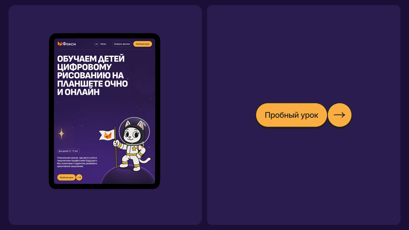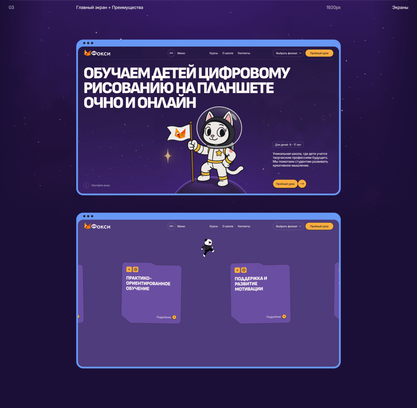 Сайт детской школы рисунка должен быть динамичным и вдохновляющим. Развивая идею «Вселенной Фокси», мы сделали маскотов героями анимаций и интерактивных элементов. При загрузке сайта кошка разворачивает главный экран, а по карточкам преимуществ школы прыгает панда.