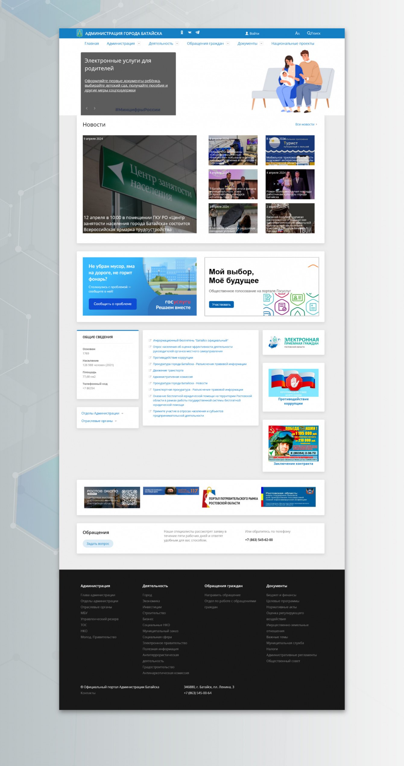 Результатом исполнения Государственного контракта стал полнофункциональный сайт батайск-официальный.рф, выполненный в соответствии с техническим заданием в установленные сроки. Были зарегистрированы новые данные хостинга и доменного имени с дальнейшей передачей прав Заказчику. Навигация по сайту понятна пользователям, современный дизайн и гармоничная цветовая схема позволяет комфортно работать с каждой страницей. Представители Заказчика самостоятельно публикуют новостной контент и необходимую информацию. Платформа устойчива к внешним атакам и имеет собственную систему защиты от несанкционированного доступа.