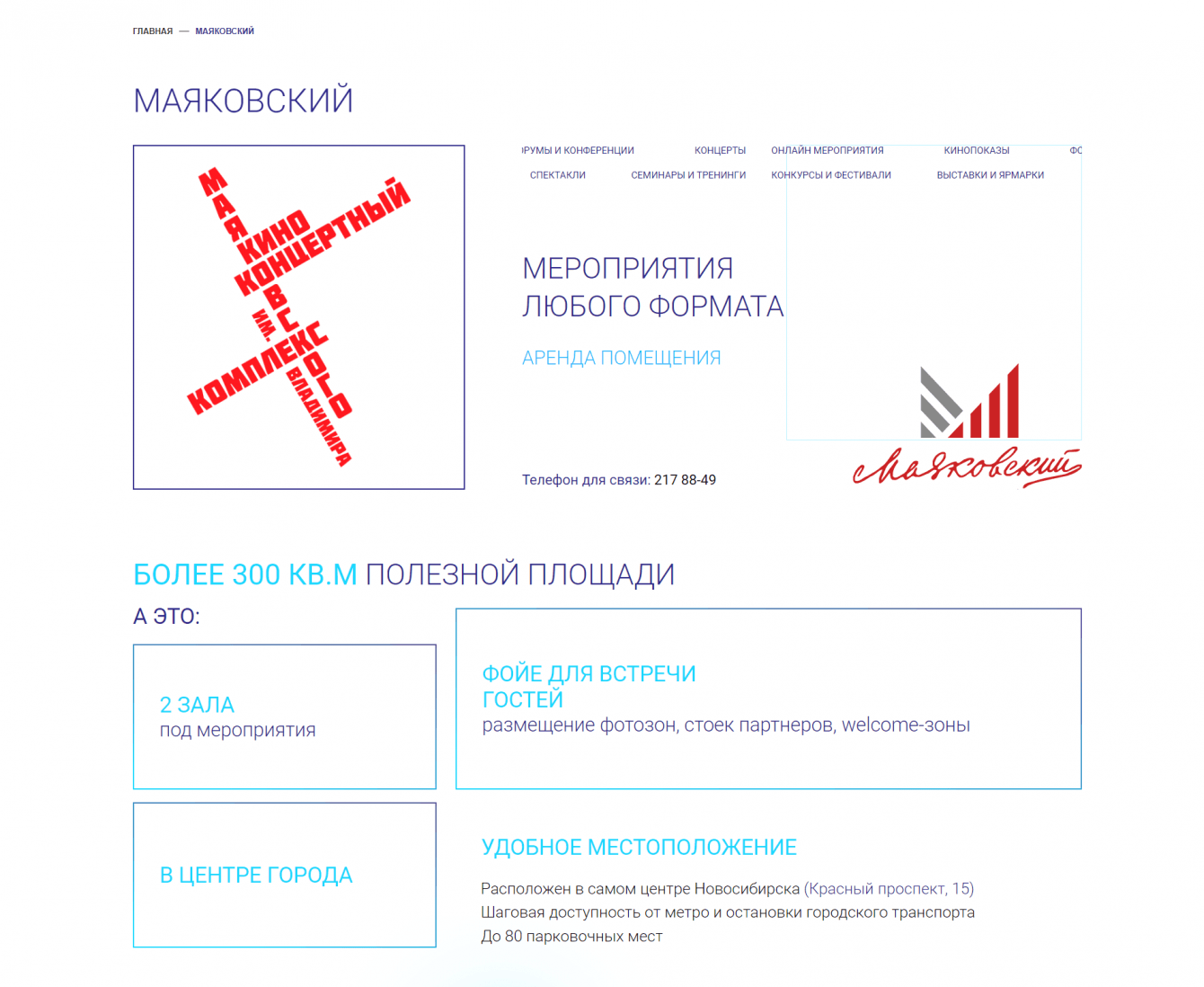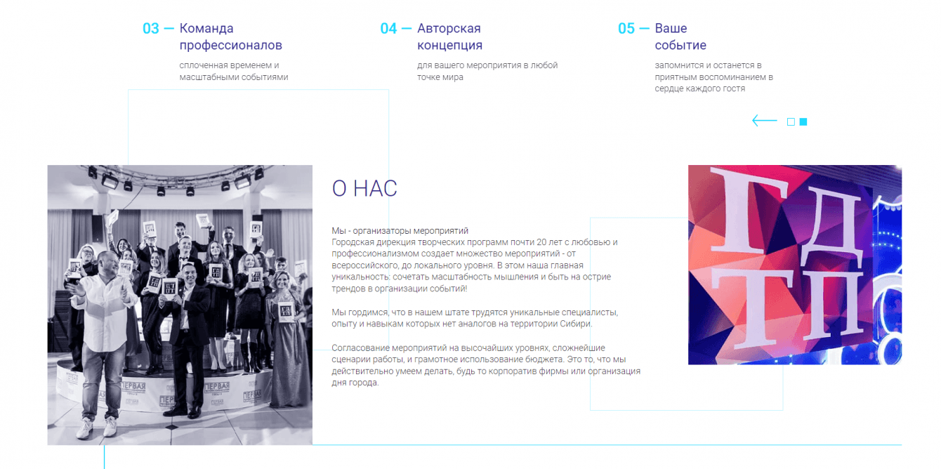 7. Разделили оказываемые услуги по направлениям: организация событий; режиссура и сценарии; оформление, дизайн и сценография; аренда залов в ККК им. Маяковского; организация гастролей; продакшн. Внутрь каждого раздела добавили описание услуг и выполненные проекты по каждой из них.