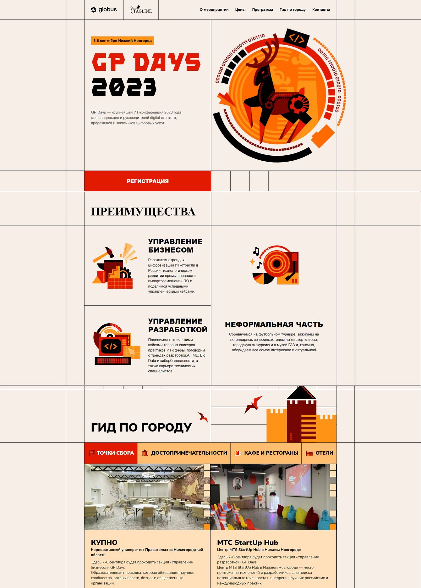 На сайте мы детально проработали график конференции, наглядно показав тайминг, спикеров и возможности посещения выступлений, экскурсий и развлекательных мероприятий в рамках GP Days. Так как конференция федерального масштаба, для участников из других городов мы предусмотрели раздел «Гид по городу». В нем собрали самое главное: где пройдет конференция, достопримечательности города, кафе и отели.