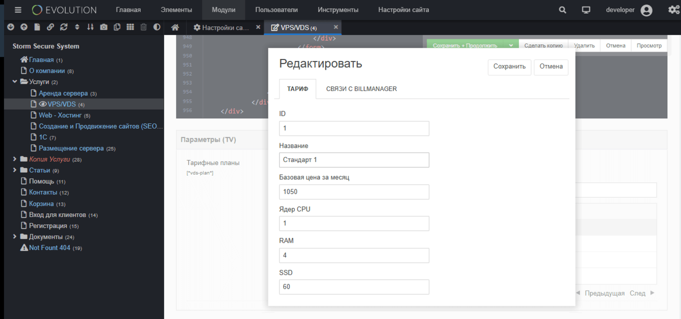 Выполнено управления тарифами и контентом на сайте на базе админки CMS ModX Evo