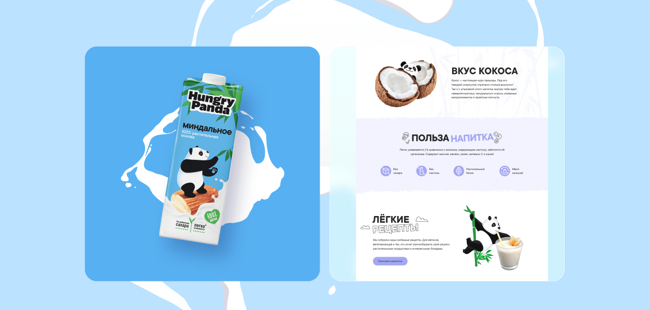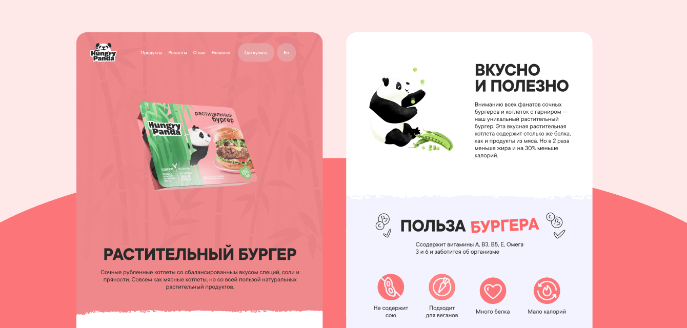 Компания «Русагро» выходила на рынок с новым брендом растительных продуктов — Hungry Panda. К нам клиент обратился для того, чтобы с нуля собрать сайт под этот запуск. Коммуникация только-только сформировалась, а каких-то дизайн-элементов было немного — только с упаковок продуктов.