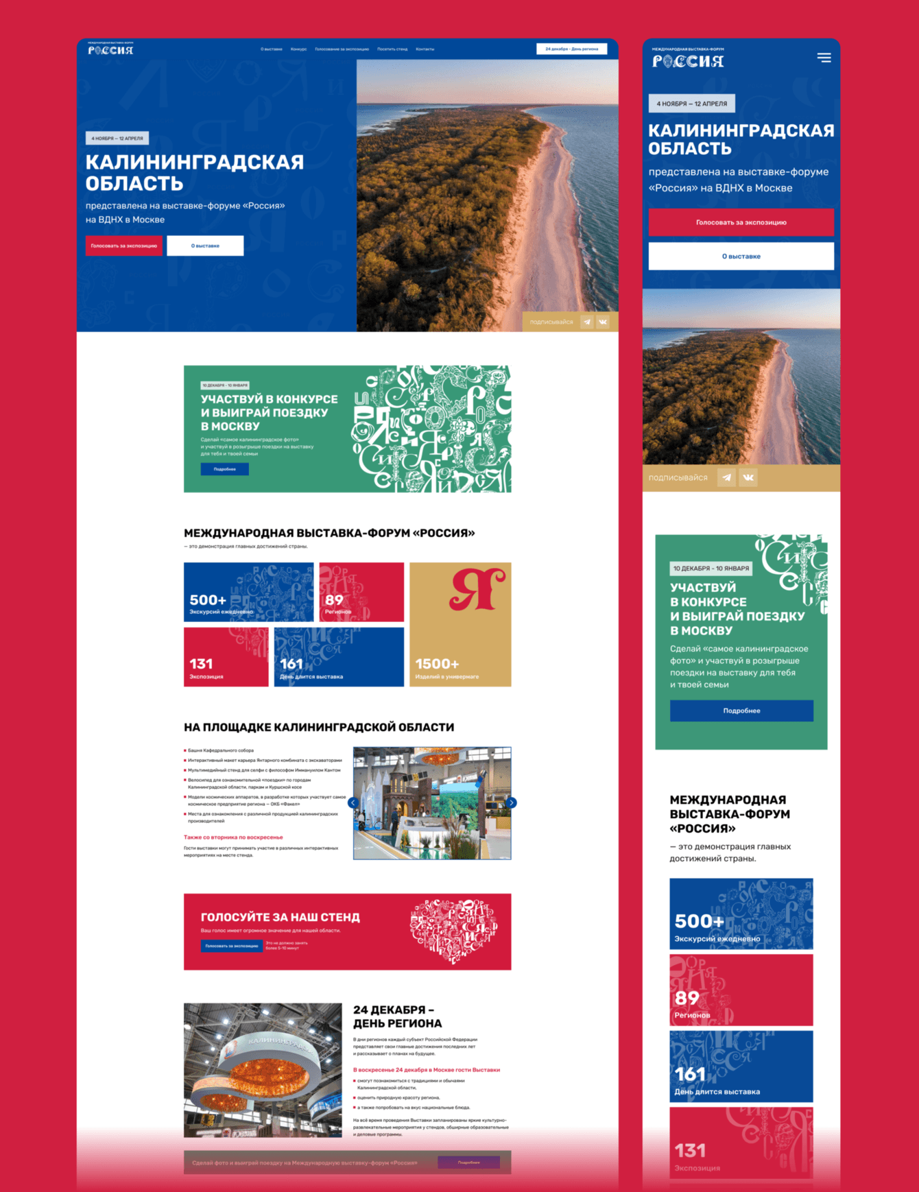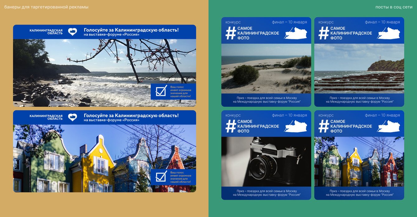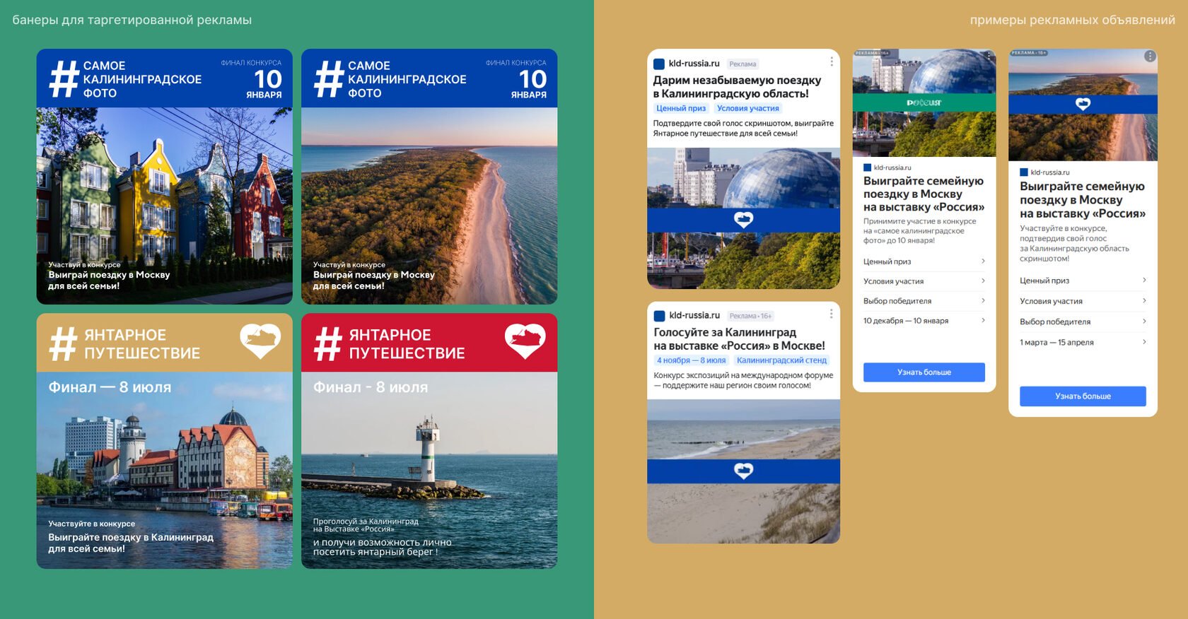 Калининградская область принимала участие в Международной выставке-форуме «Россия» на ВДНХ (ноябрь 2023 — июль 2024). Задача: популяризировать участие региона в выставке, вовлечь местных жителей, мотивировать их посетить стенд Калининградской области и проголосовать за него в конкурсе. Для этого требовались сайт, наружная реклама, чат-бот и комплексное онлайн-продвижение.