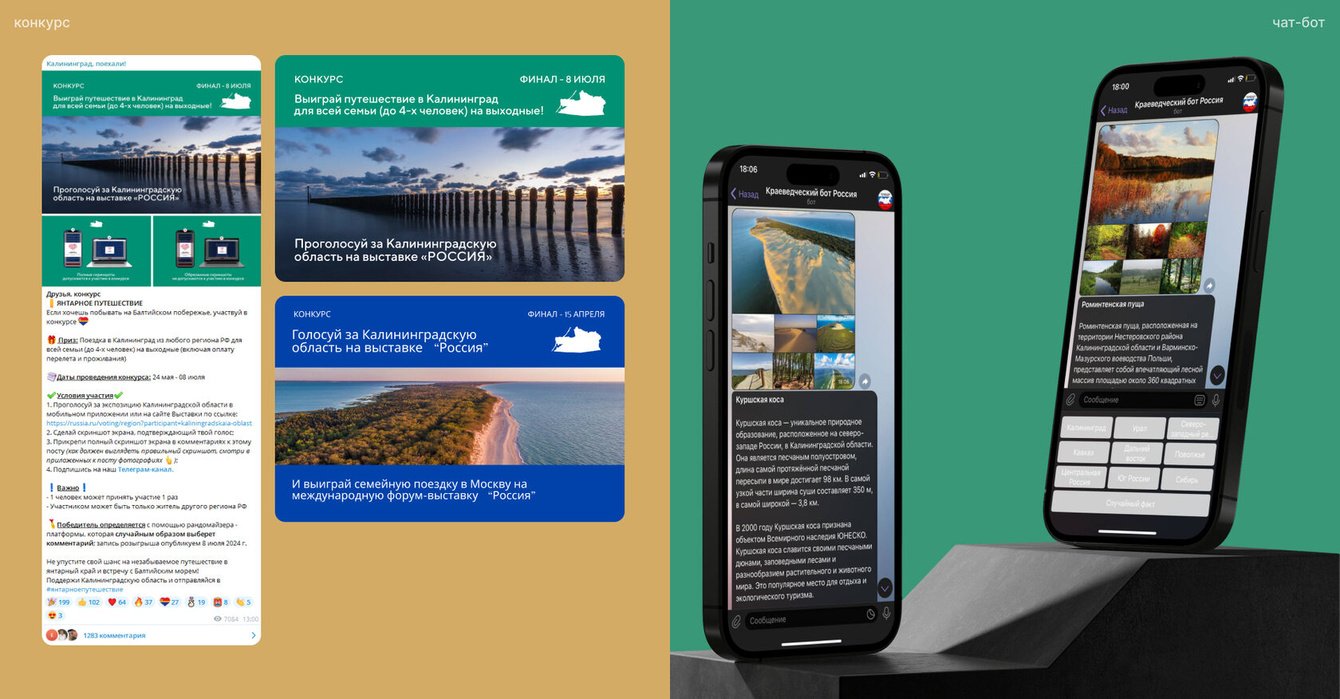 Разработали сайт с полной информацией о выставке и участии региона. Создали наружную рекламу по ключевым точкам Калининграда. Разработали Telegram чат-бот с конкурсной механикой для повышения вовлечённости аудитории. Запустили комплексную рекламную кампанию в социальных сетях и Яндексе.