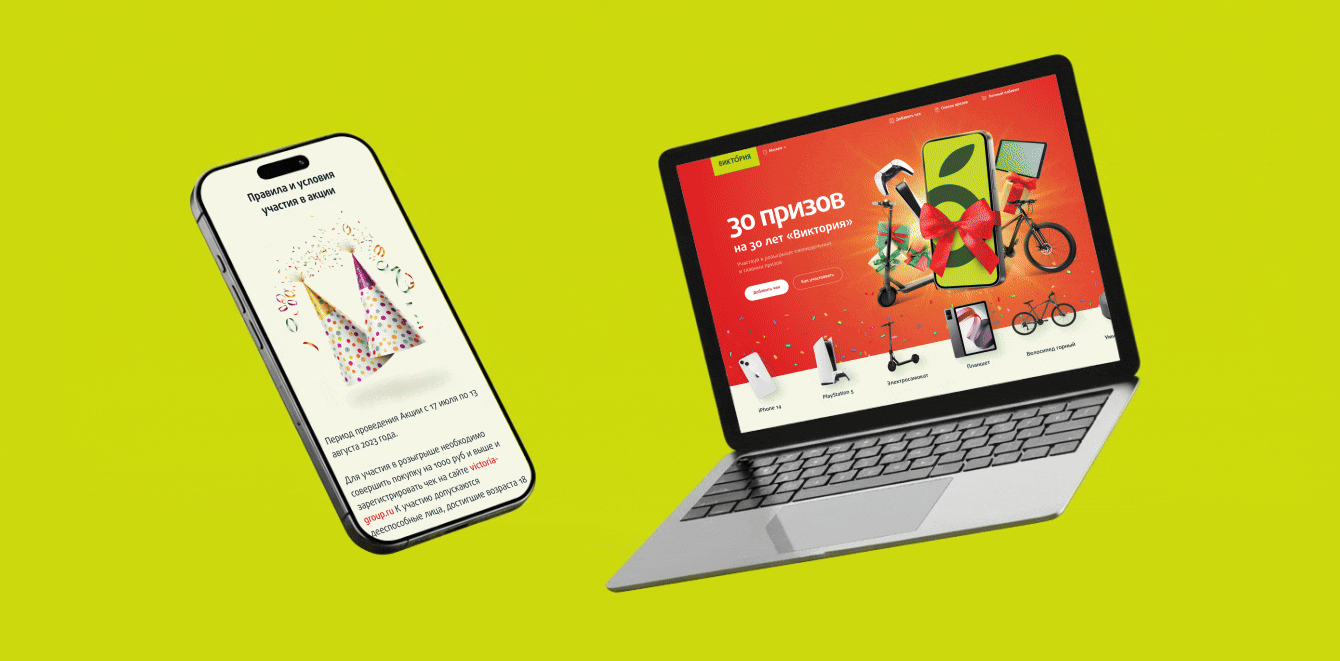 Для промоакций разработали лендинги. Например, создали страницу с акцией ко дню рождения «Виктории» и добавили на нее возможность регистрации чека, анимацию, рейтинг победителей по городам и фильтры по номерам розыгрышей.