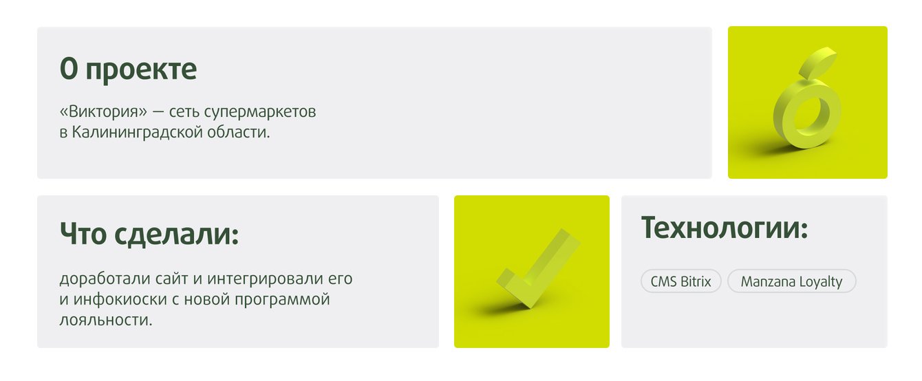 Новая программа лояльности «Виктории» работает на интеллектуальной платформе Manzana Loyalty. Мы интегрировали с Manzana сайт и инфокиоски. Теперь пользователь может посмотреть данные в своем профиле на сайте и в инфокиоске.