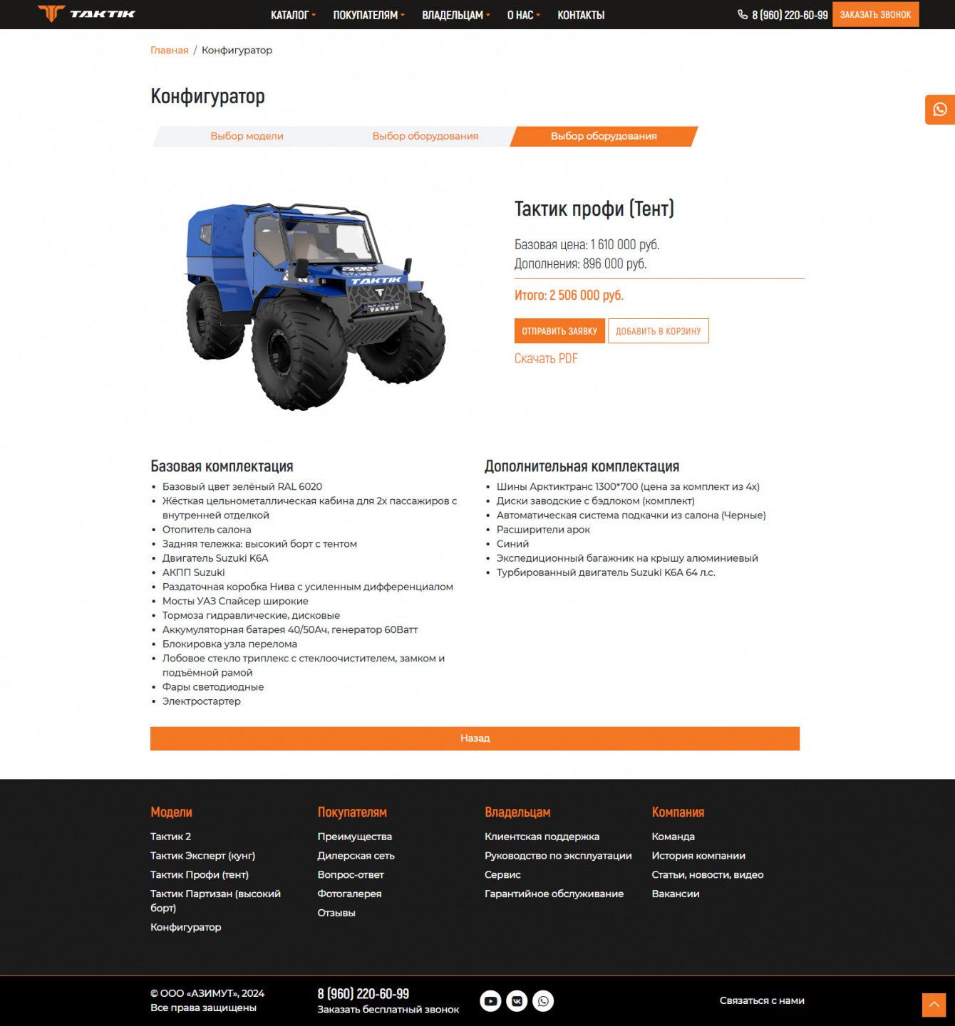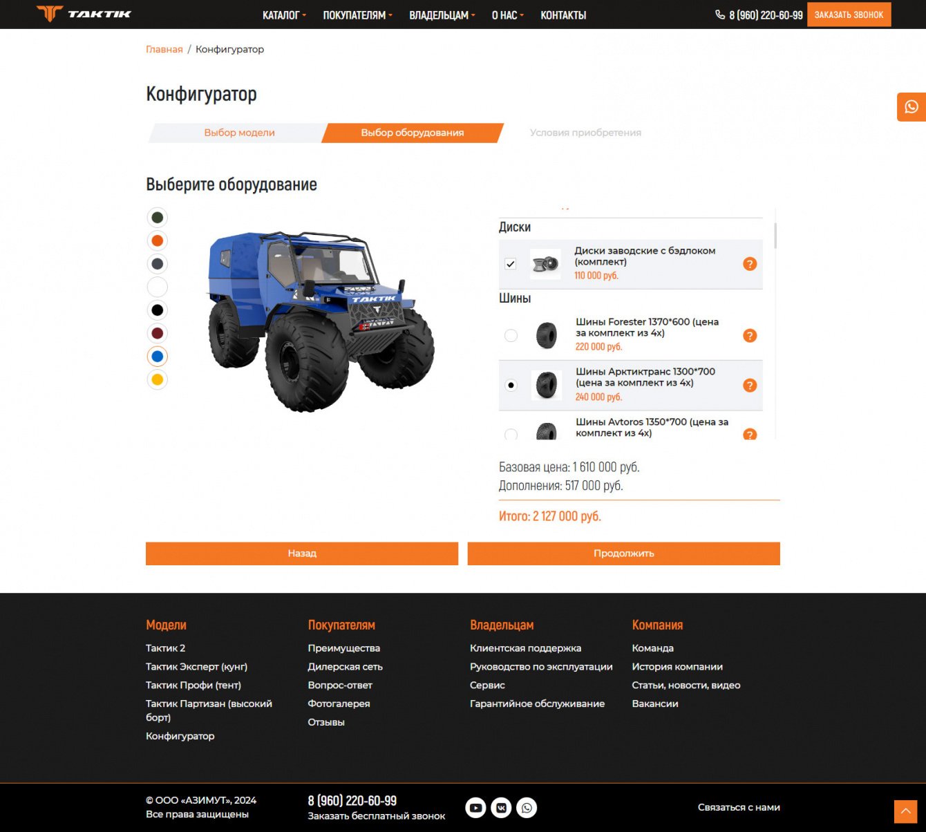 По просьбе клиента, был разработан конфигуратор, чтобы покупатели, могли собрать свой вездеход из представленных компонентов, а также увидеть окончательную стоимость вездехода.