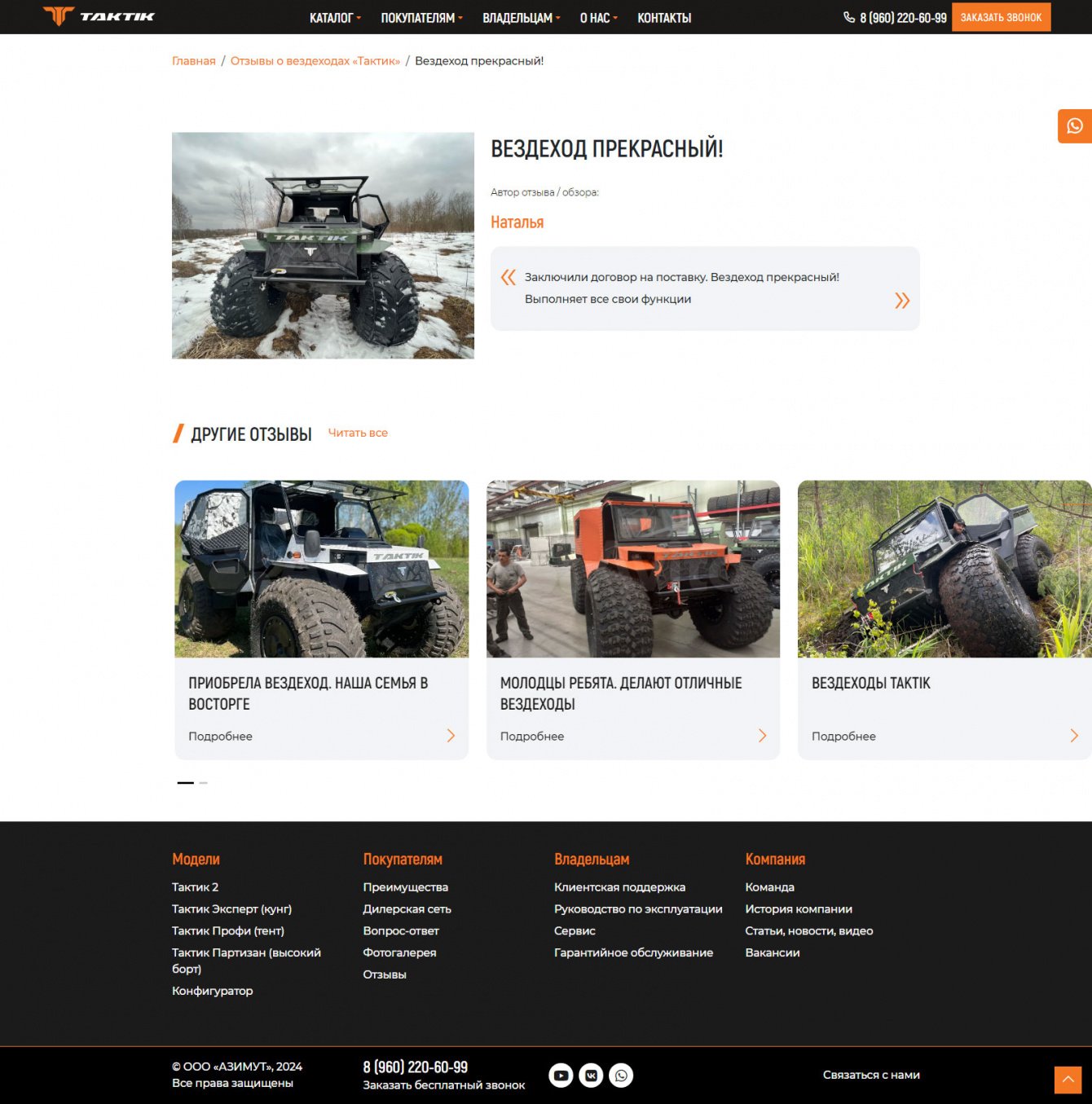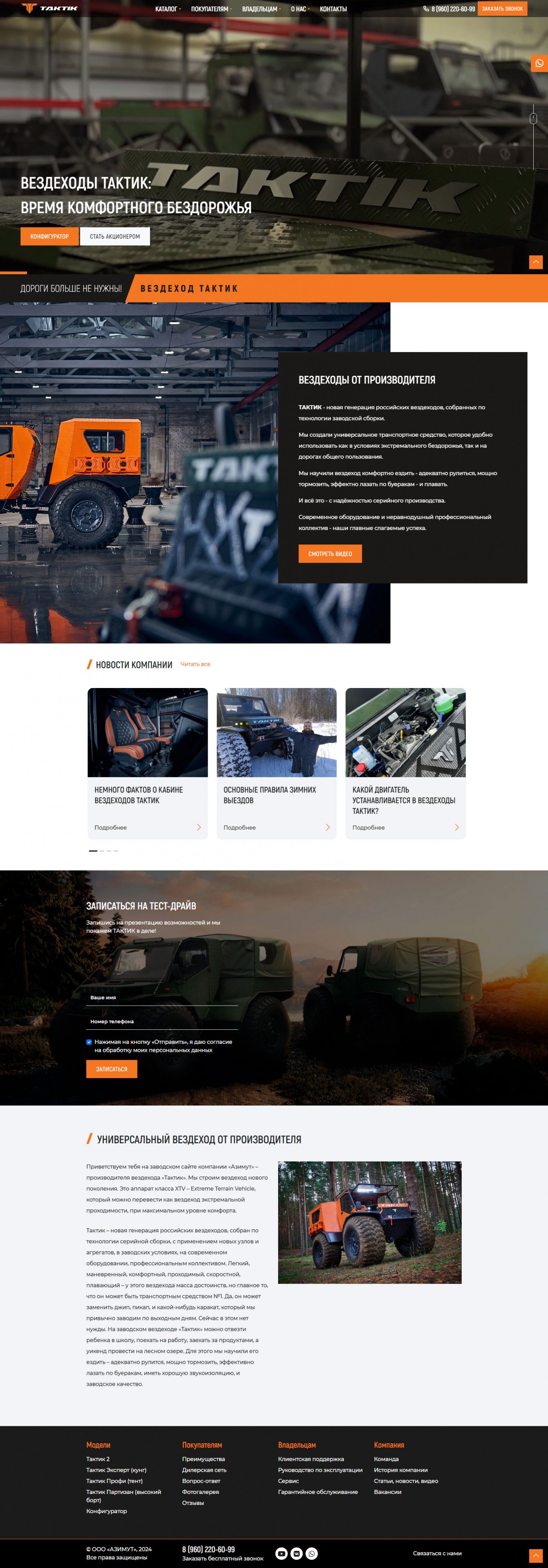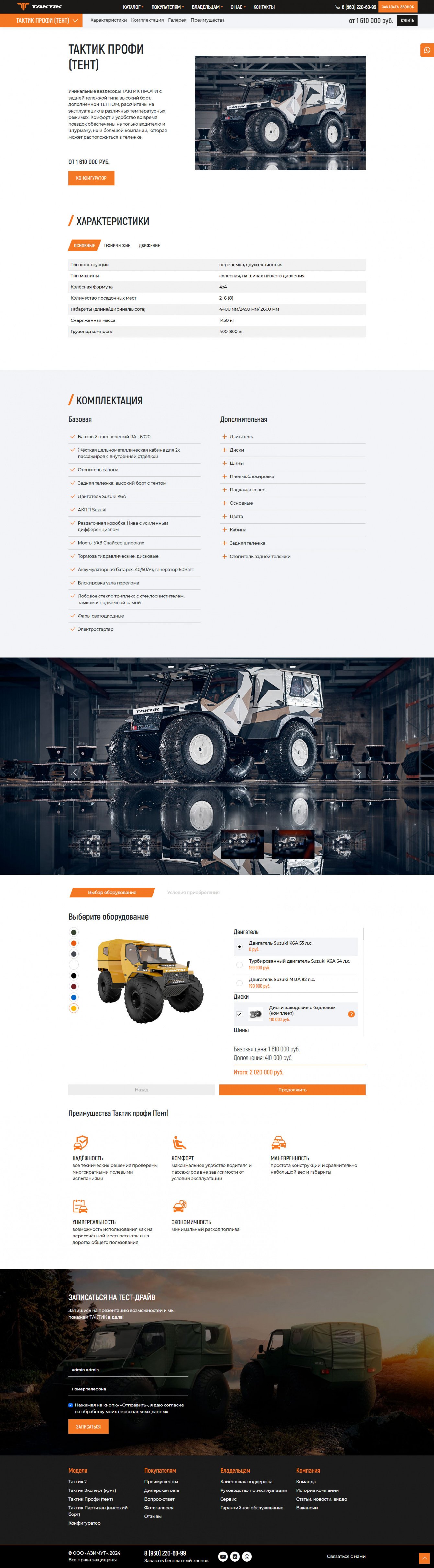 Нами был разработан сайт, на котором представлена вся линейка вездеходов «Тактик», а также дополнительная информация для клиентов и дилеров.