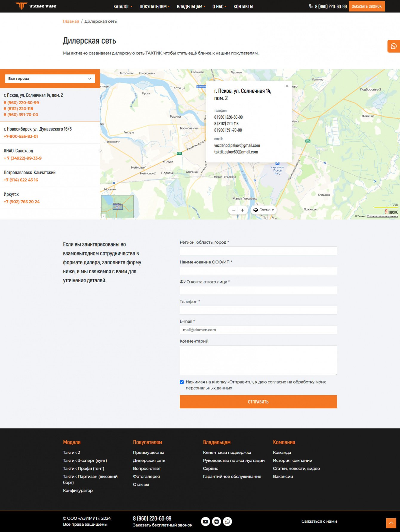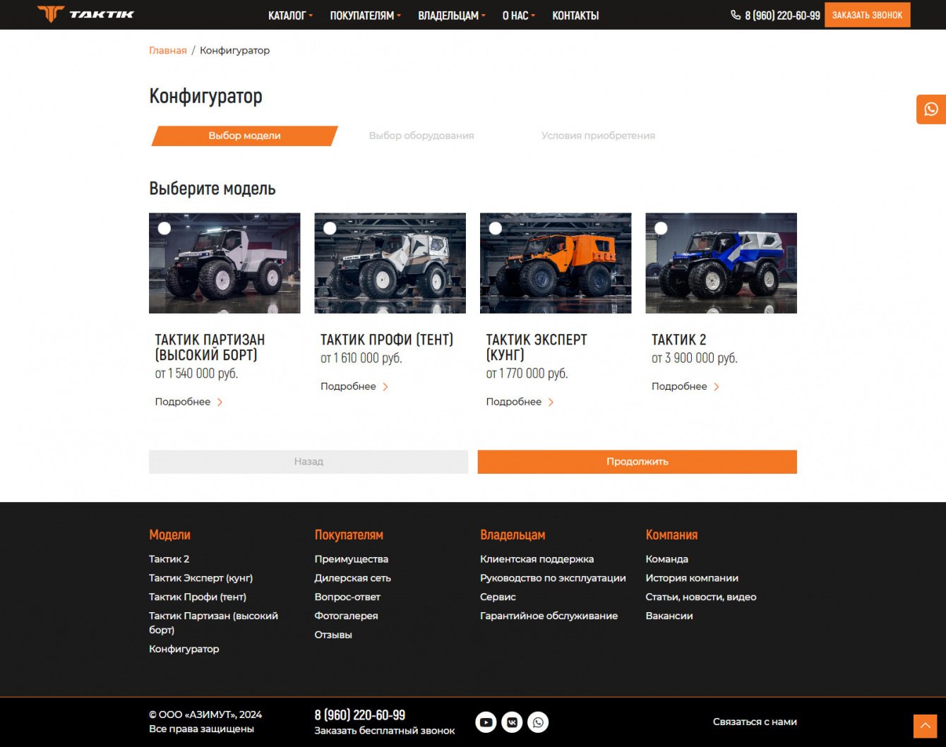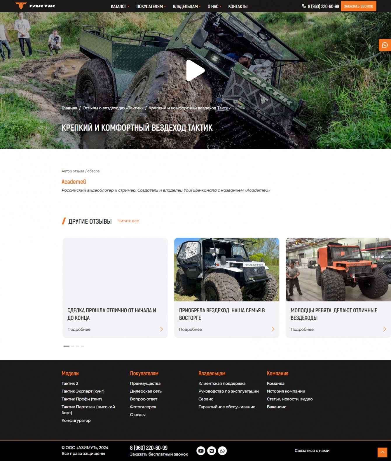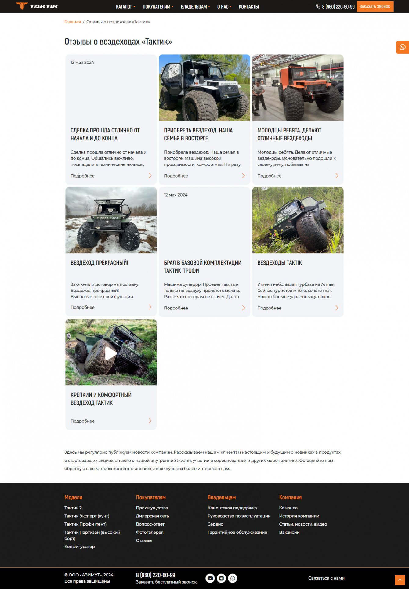 Нами был разработан сайт, на котором представлена вся линейка вездеходов «Тактик», а также дополнительная информация для клиентов и дилеров.