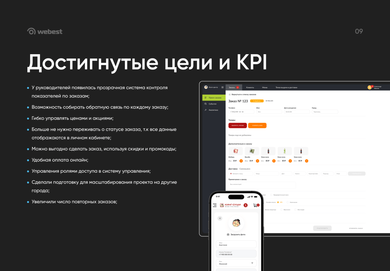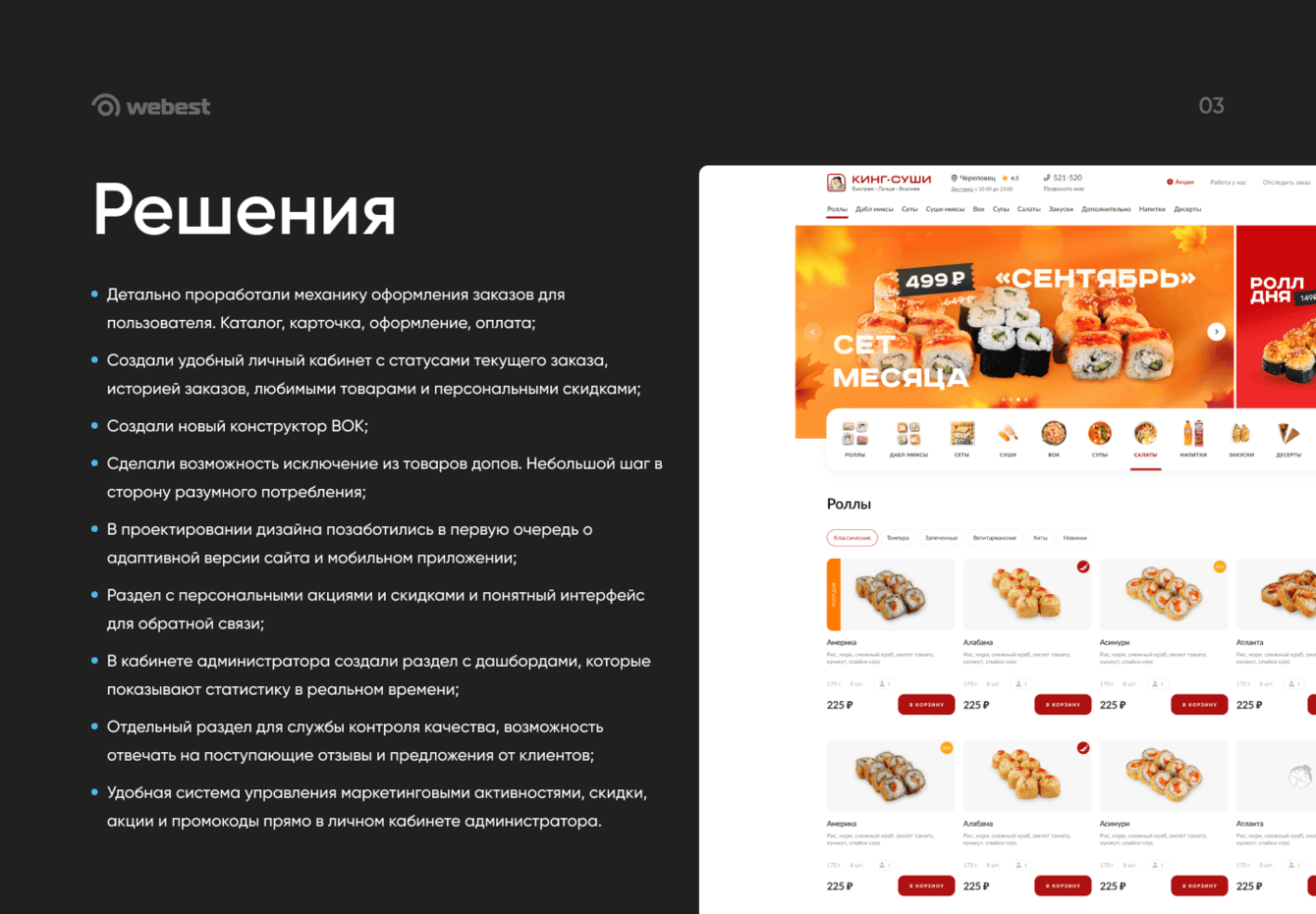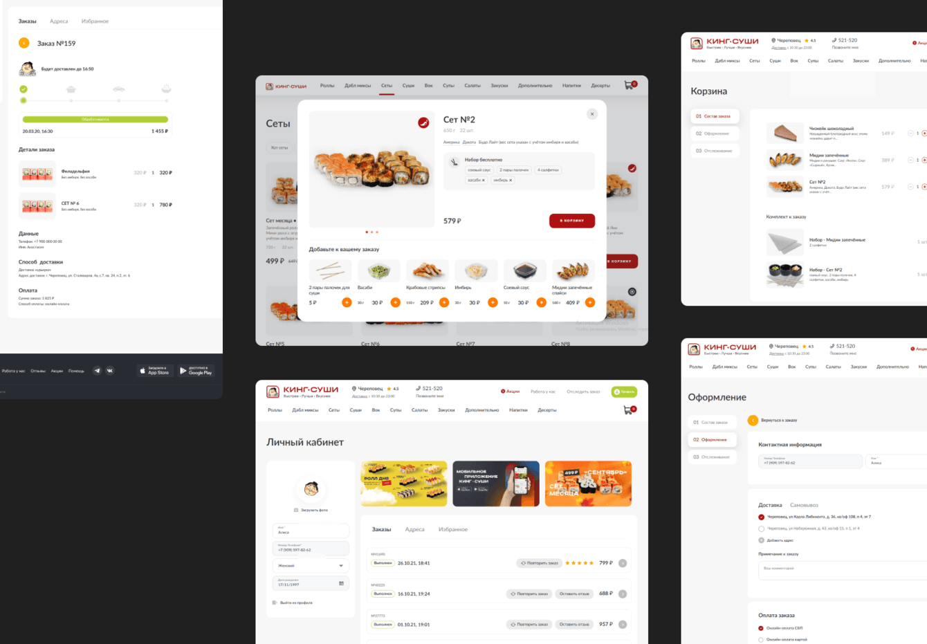 Разработка сервиса доставки готовой японской еды. «КингСуши» — один из лидеров доставки в Вологодской области: 300 заказов ежедневно. Существенная доля заказов до 2021 года приходила по телефону с колл-центра компании. Заказ по телефону для пользователя неудобен и не информативен, а для бизнеса это расходы на обработку заказов. Было принято решение оцифровать данный канал.