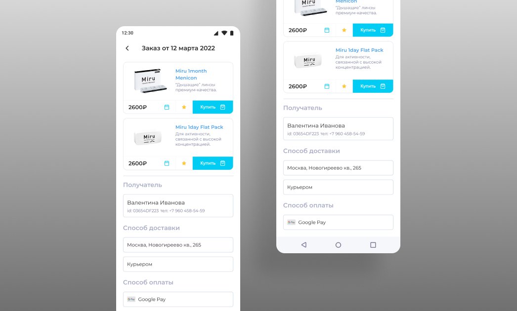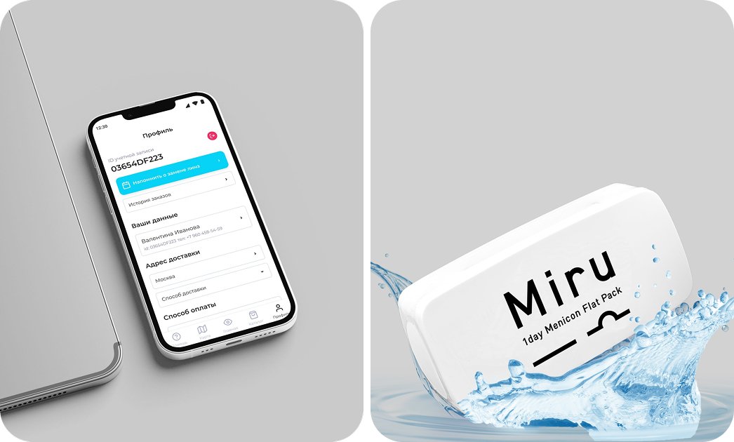 В мобильном приложении как и в web-версии, покупатели могут применить промокод, просмотреть историю заказа, повторно оформить полюбившийся продукт и отследить статус отправления. Фишкой приложения является календарь покупок линз и уведомления для пользователей об окончании срока их использования.