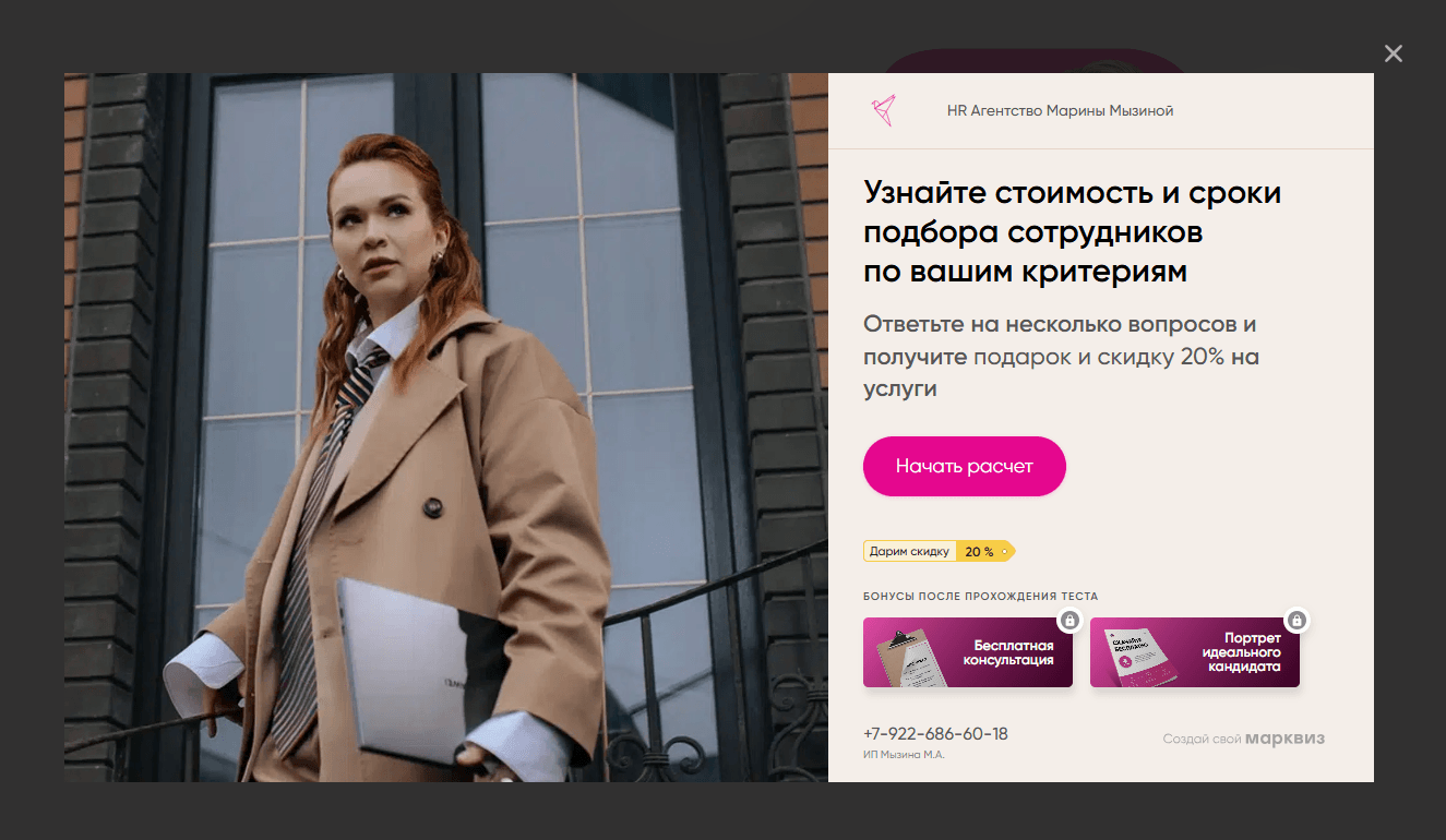 - Квиз по подбору персонала (отсекает “пустые” заявки, выдает бонусы)