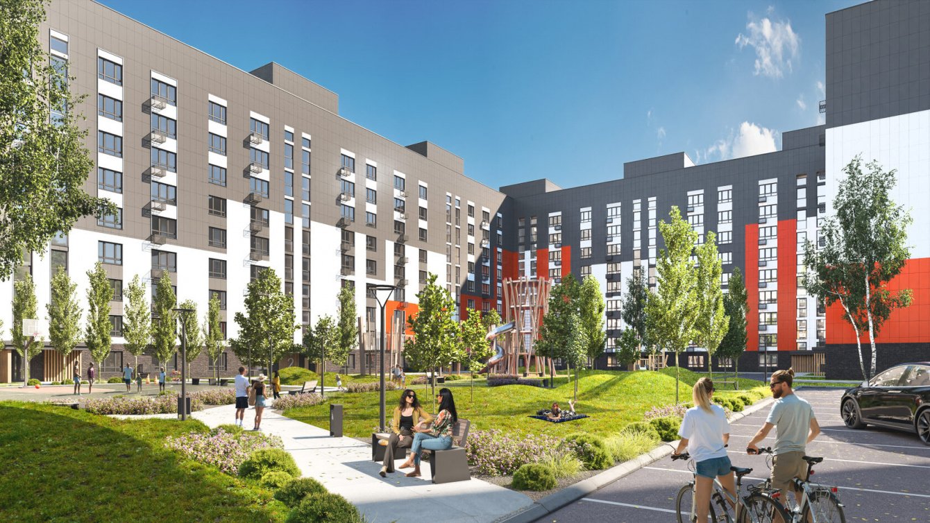 Заглавная идея жилого комплекса — «новая энергия города». Её же мы отразили в 3D-визуализации экстерьеров (рендерах), сделав акцент не на архитектурных преимуществах, а на активном образе жизни жителей: велопрогулки, современная детская площадка, близость природы.
