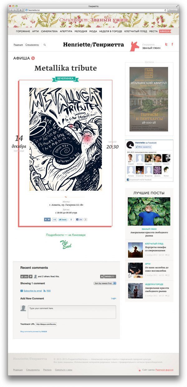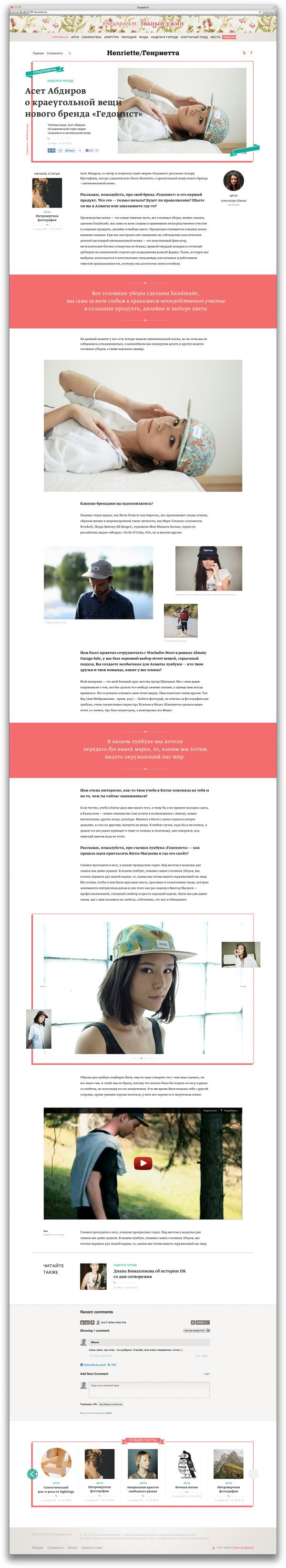«Генриетта» появилась как блог Аскара Мустафина и Асель Джабасовой о современной городской культуре. Со временем количество материалов выросло, появились спецпроекты, возникла необходимость в размещении рекламы.