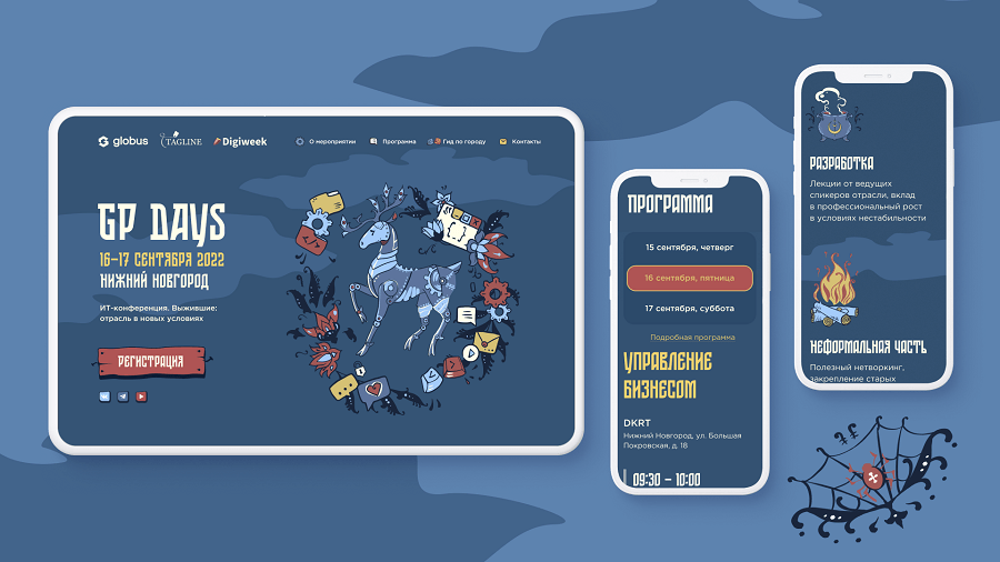 Особое внимание уделялось деталям: в прошлом году кнопки на сайте были по мотивам росписи русских игрушек, в этом году — в виде старых табличек. Кроме того, изменили портреты в блоке «Контакты»: отрисовали в согласованной стилистике людей, которые представляли GP Days.