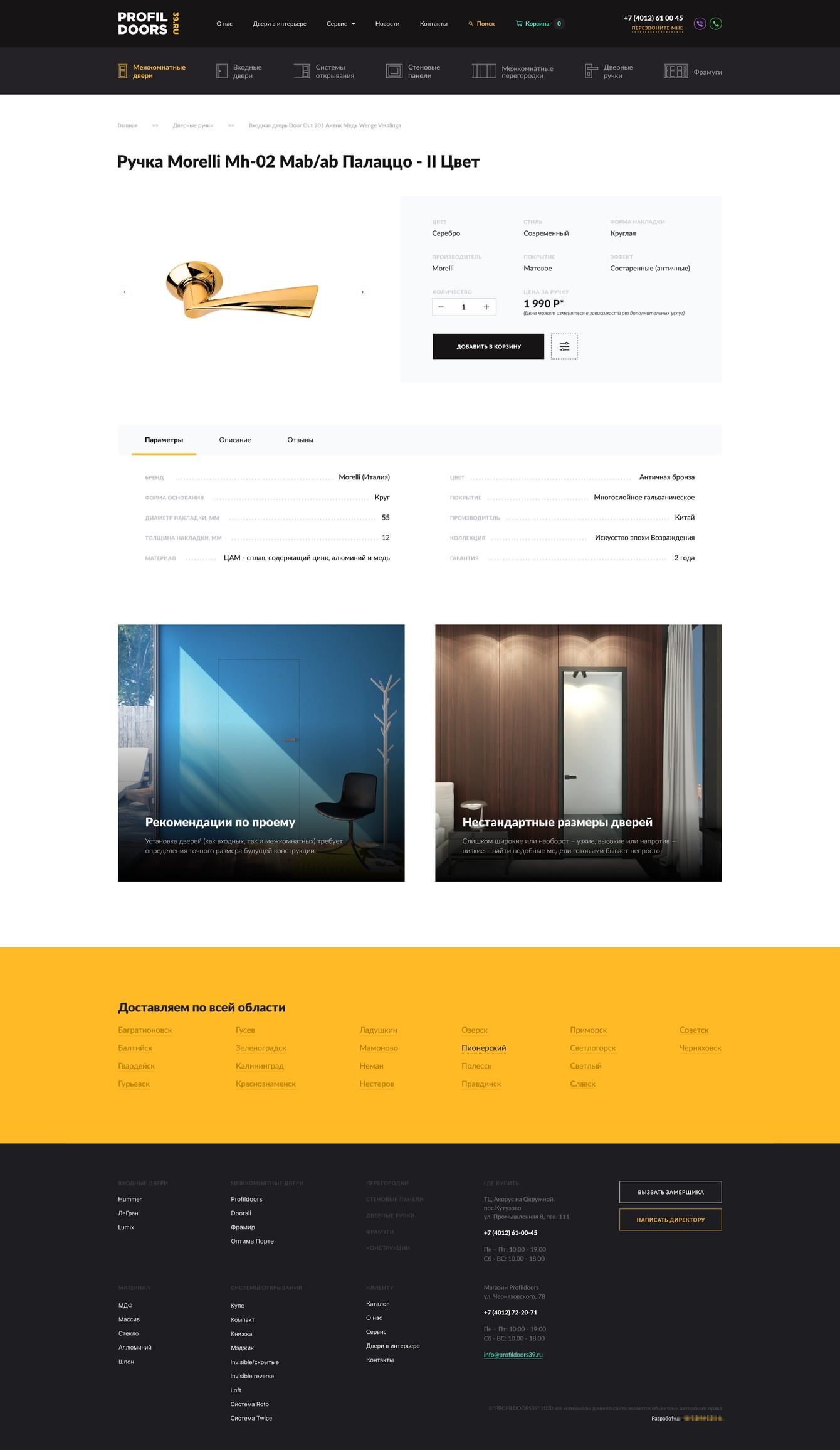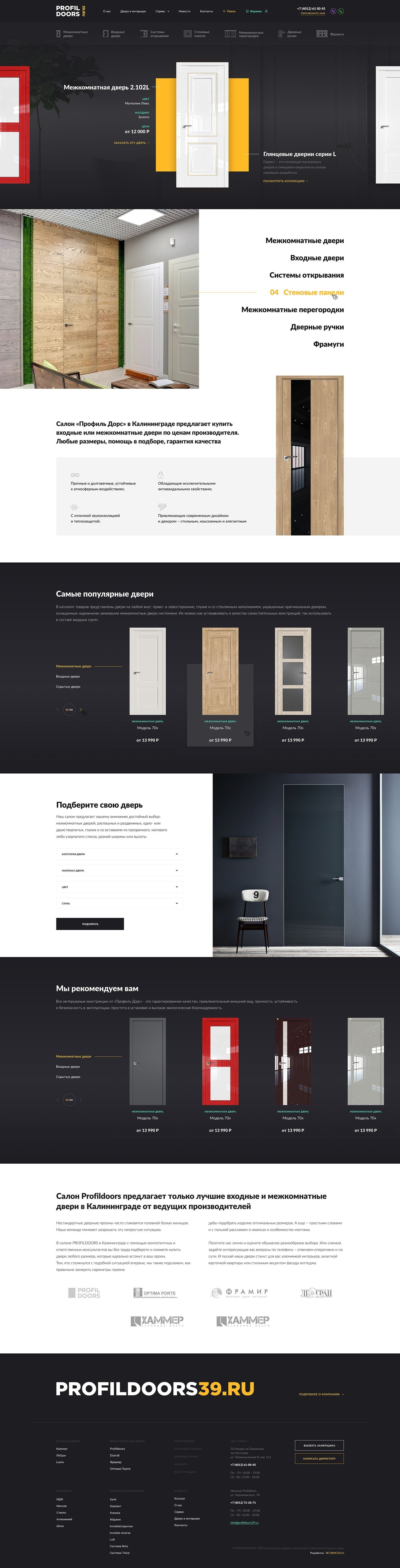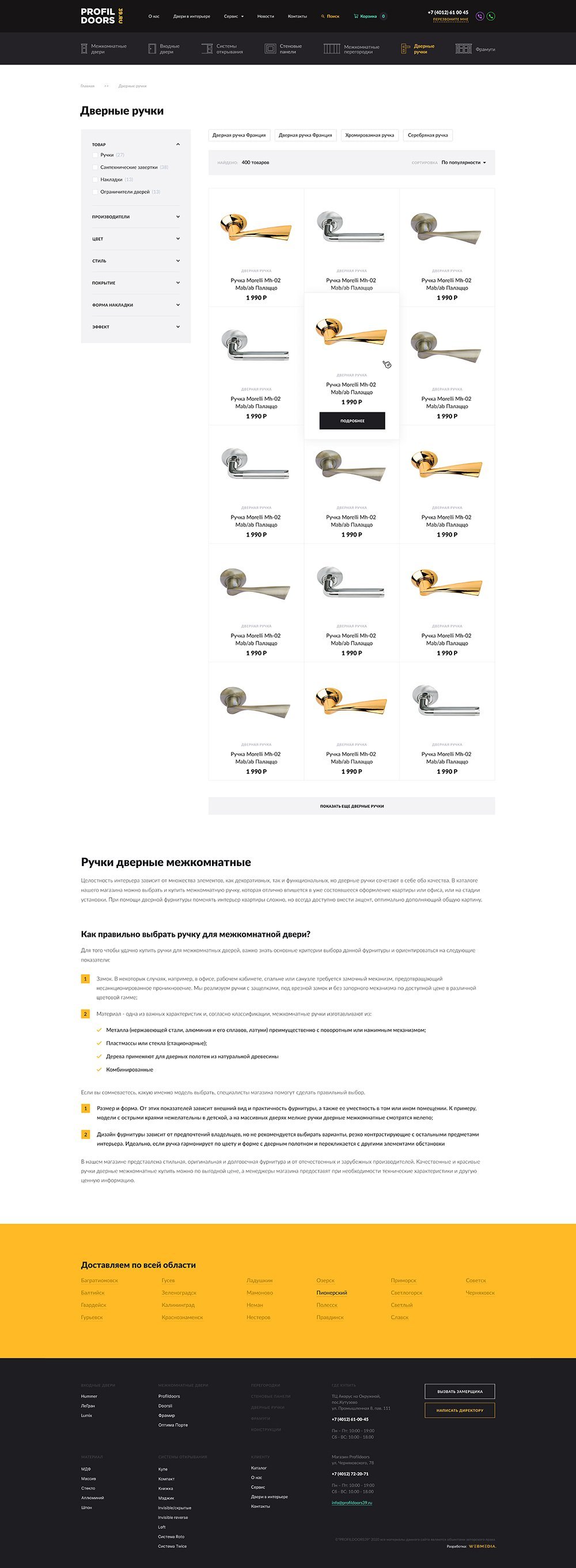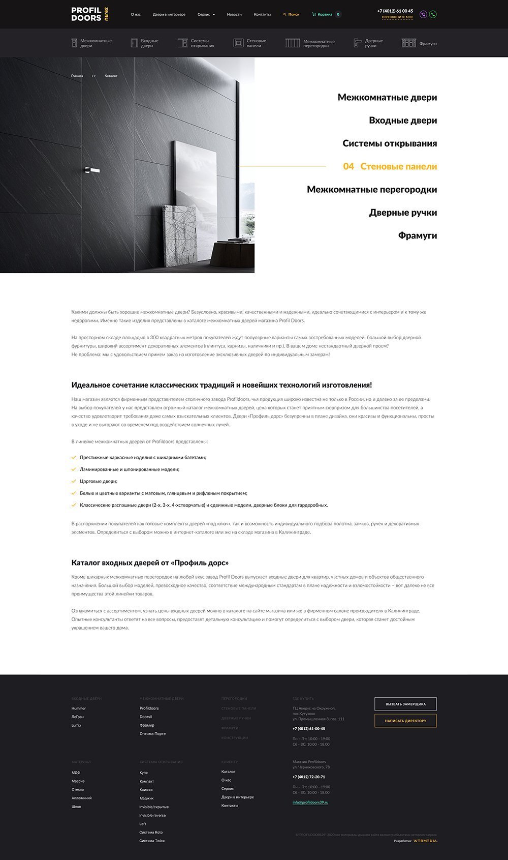 Для каждого раздела товара: межкомнатные двери, скрытые двери, алюминиевые двери, входные двери, стеновые панели, системы открывания, межкомнатные перегородки, фрамуги — был разработан индивидуальный дизайн.