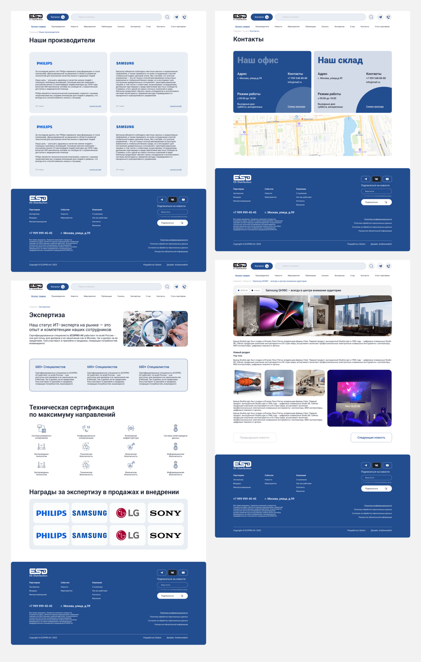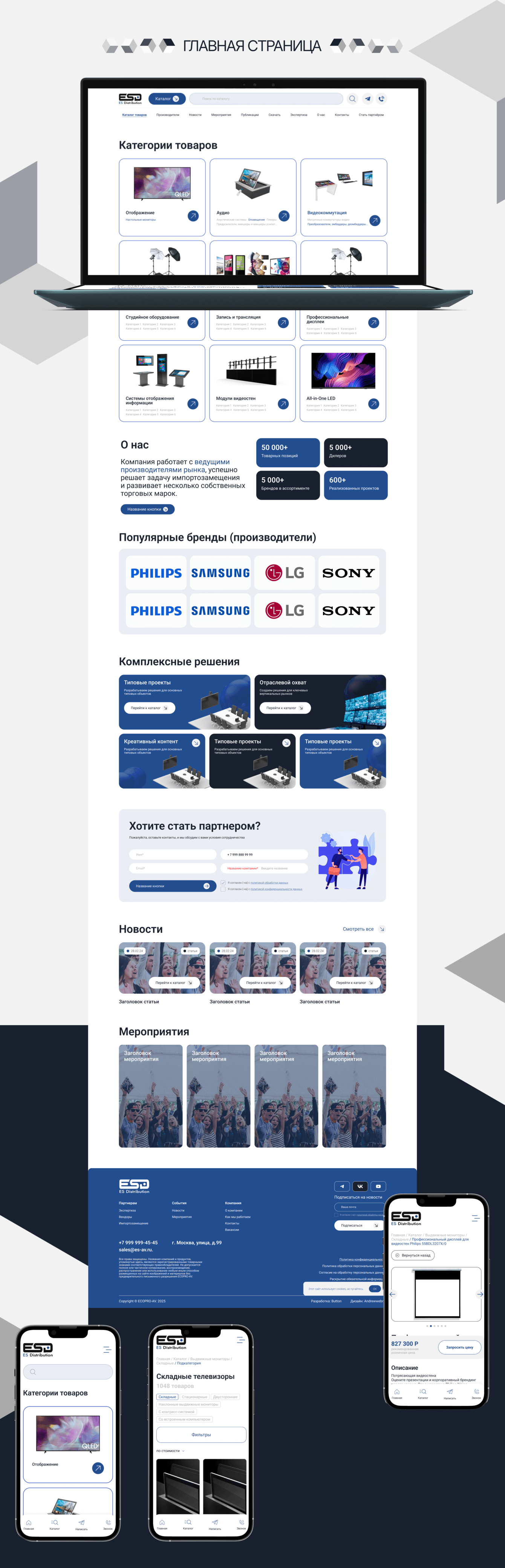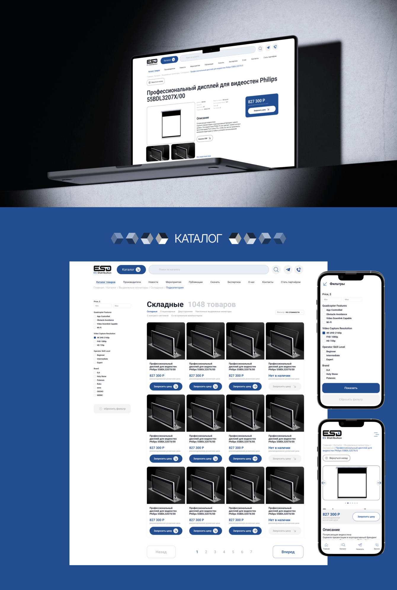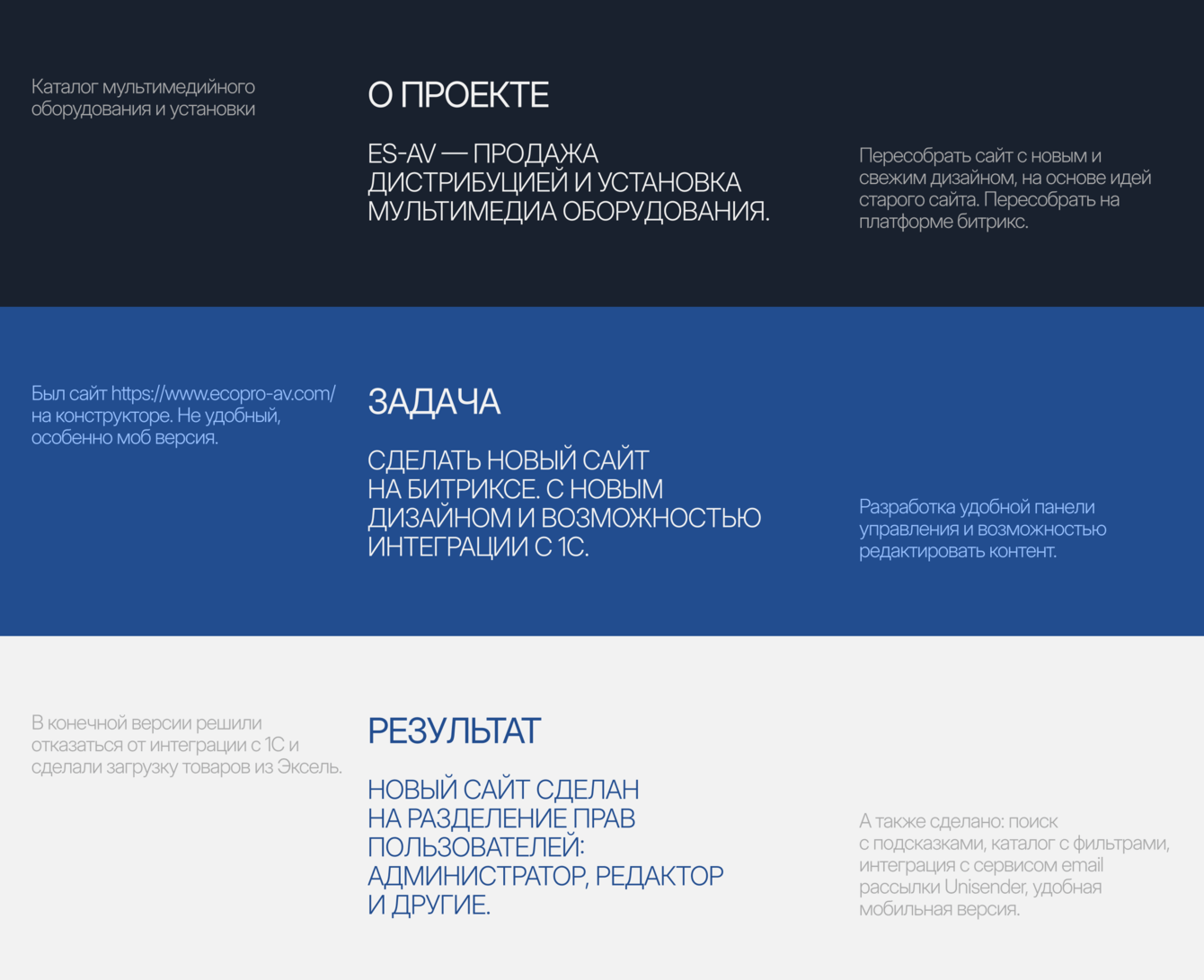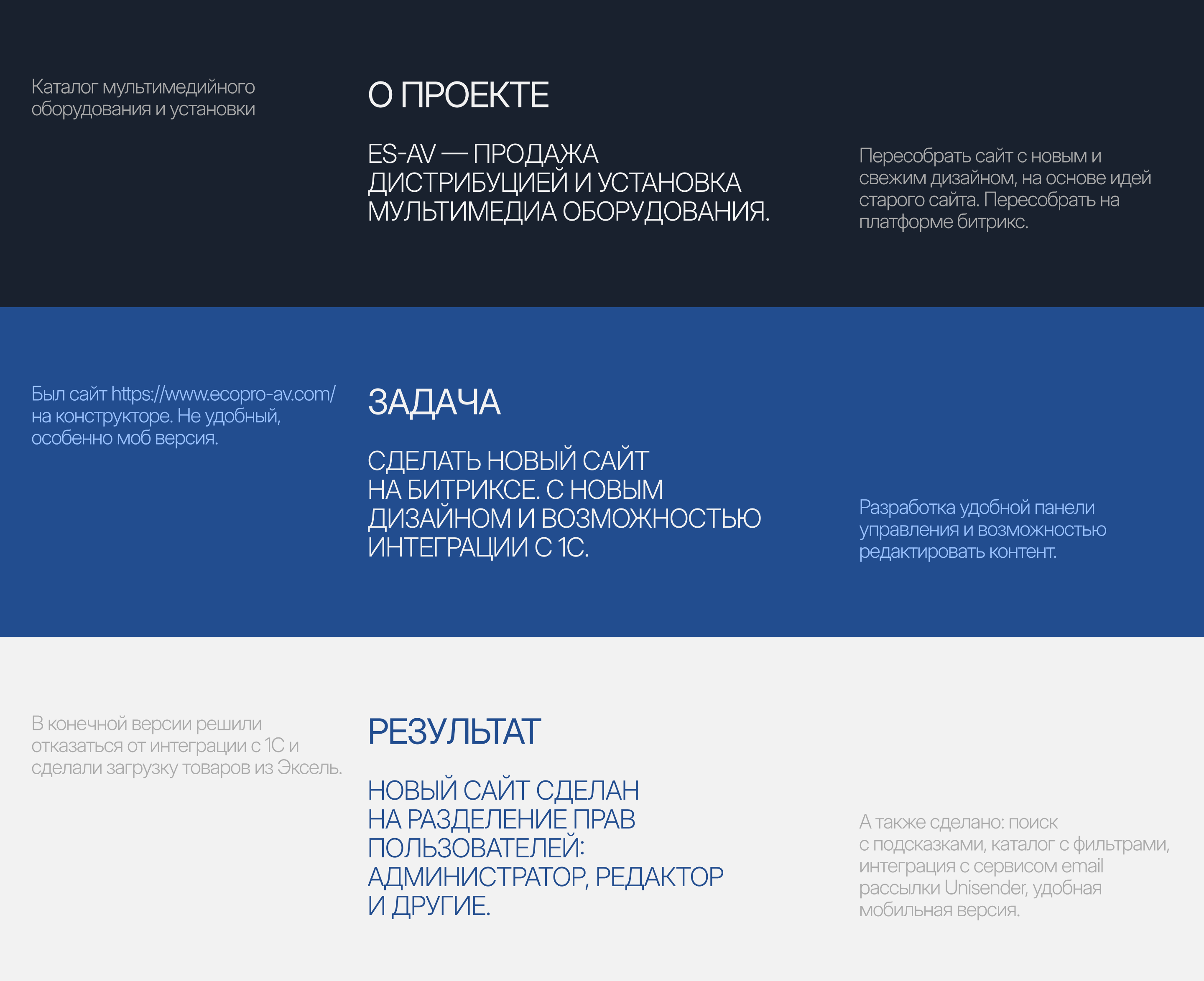ES-AV — продажа дистрибуцией и установка мультимедиа оборудования. Каталог мультимедийного оборудования и установки. Пересобрать сайт с новым и свежим дизайном, на основе идей старого сайта. Пересобрать на платформе битрикс.