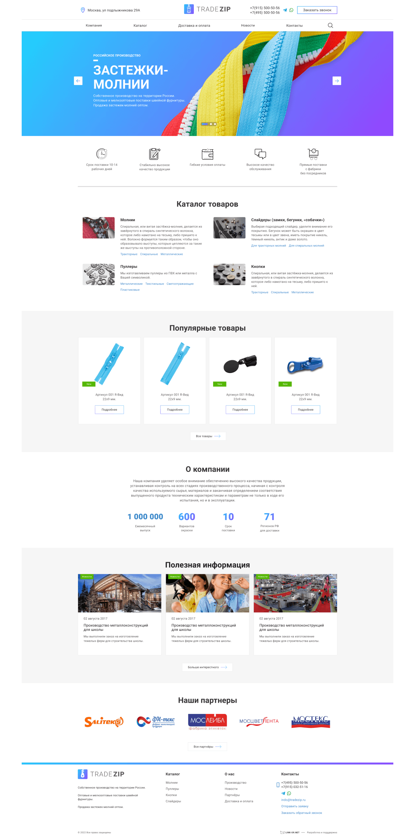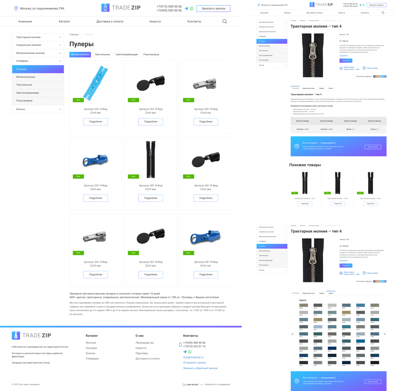 Разработали лаконичный и довольно простой сайт, где представлен весь ассортимент молний, застежек и бегунков клиента. Удобная навигация позволяет быстро найти необходимый товар. Внутри карточки реализован дополнительный функционал по подбору цвета молний.