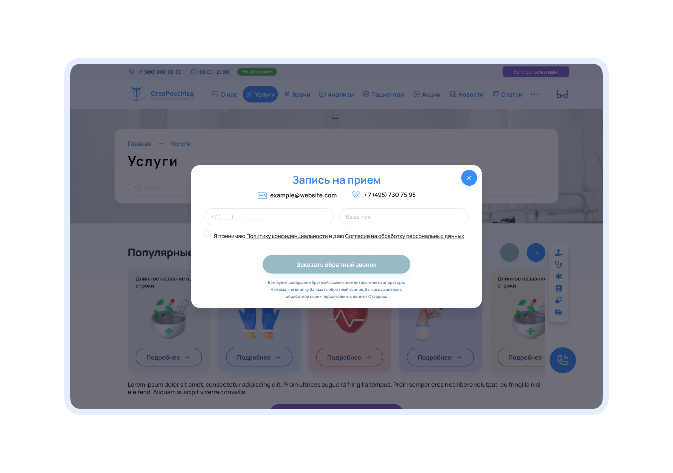 Добавлены удобные формы записи и обратной связи. Благодаря минимальному количеству шагов и понятному интерфейсу, пользователь может записаться на приём буквально за несколько секунд.
