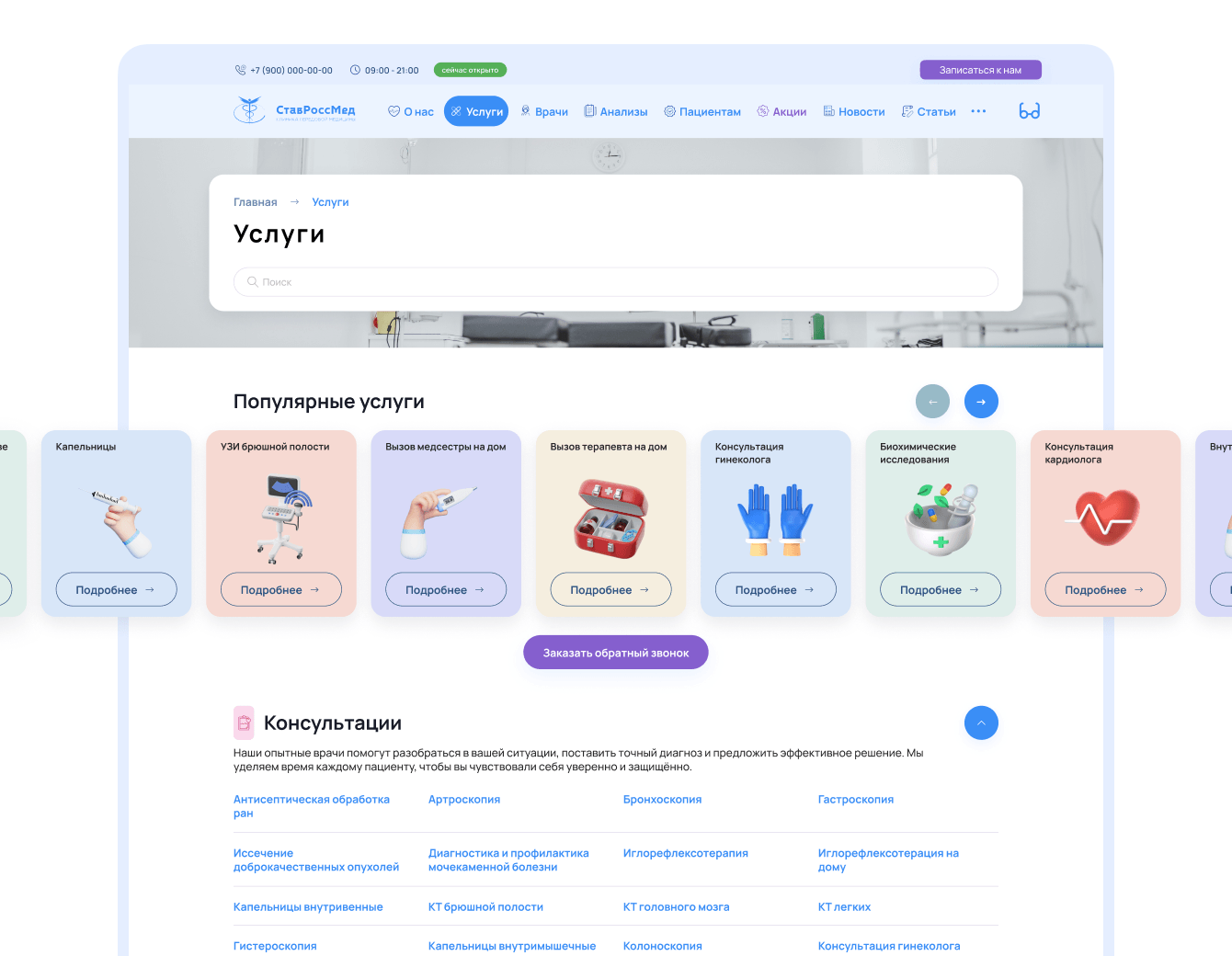Чтобы сайт клиники «Ставросс» стал действительно полезным и удобным как для пациентов, так и для сотрудников, мы детально проработали архитектуру сайта. Вся важная информация теперь доступна за считанные клики, а навигация интуитивно понятна даже впервые зашедшему пользователю. Мы позаботились о том, чтобы каждый элемент работал на результат — привлечение, удержание и информирование пациентов.
