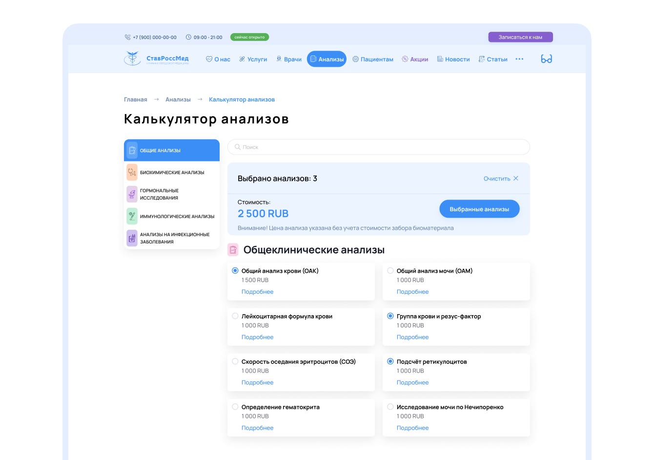 Мы наполнили сайт качественным и понятным контентом: подробно описали услуги и лабораторные анализы. Отдельным улучшением стал калькулятор анализов — интерактивный инструмент, помогающий быстро рассчитать стоимость выбранных анализов.