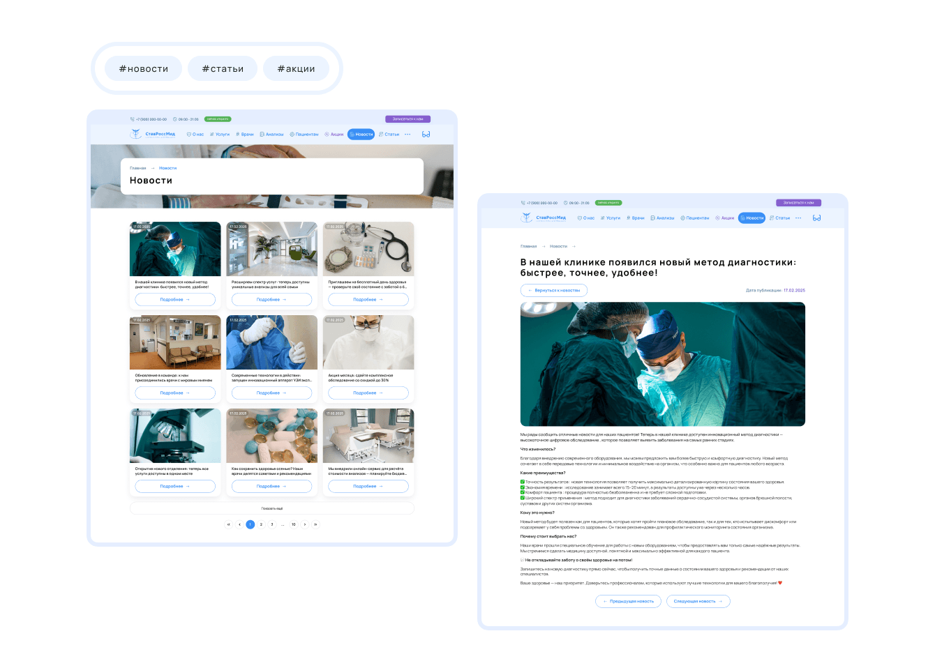 Созданы специальные страницы, где клиника публикует актуальные предложения, медицинские рекомендации и информацию о новых услугах. Это помогает не только удерживать внимание пользователей, но и формировать доверие.
