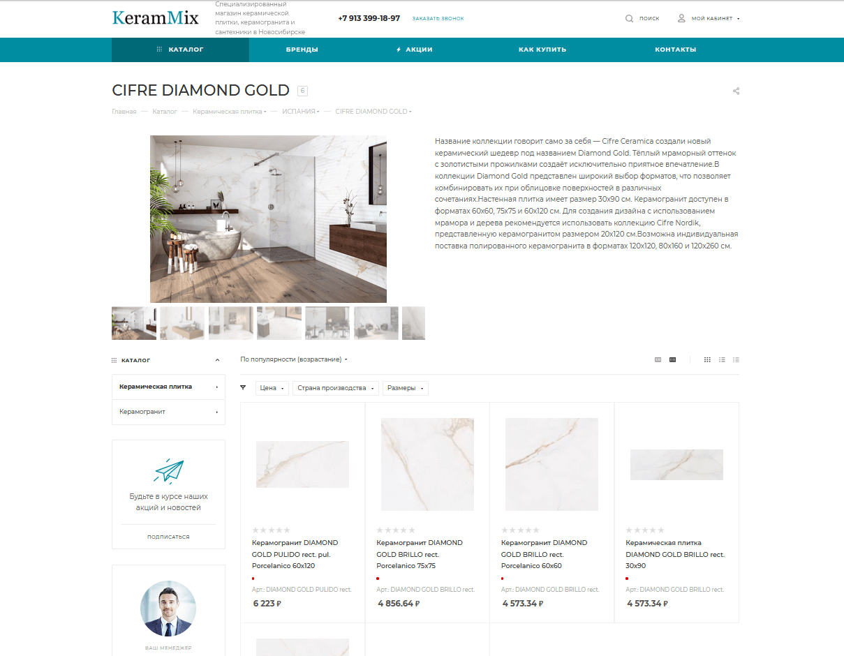 Клиент — крупный розничный магазин керамической плитки и сантехники с большим каталогом и связями с зарубежными поставщиками — обратился для создания современного веб-сайта. Основная цель — дать покупателям возможность заранее просмотреть ассортимент, ознакомиться с ценами и применением продукции в интерьере, прежде чем посетить магазин. Сайт должен быть адаптивным, удобным для пользователей и интегрированным с 1С.