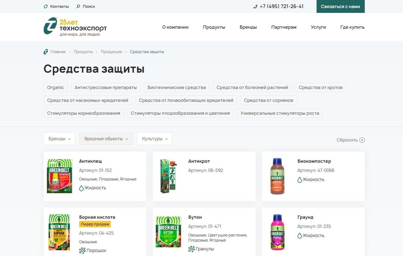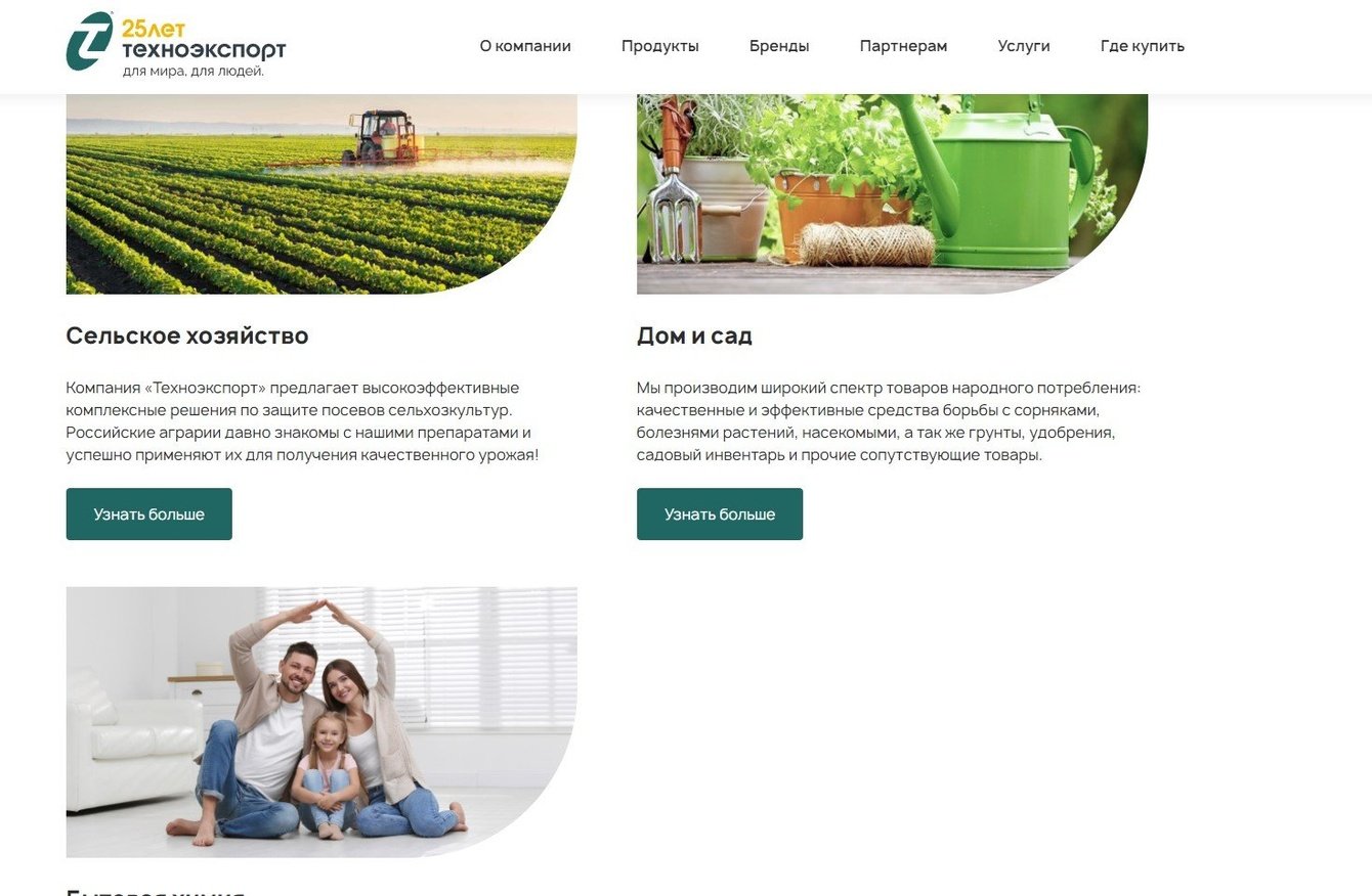 Компания "Техноэкспорт" создает комплексные решения для сельского хозяйства и садоводства, защиты дома от насекомых, грызунов, вирусов и бактерий. В процессе постоянного диалога наши дизайнеры подготовили макеты всех внутренних страниц сайта, десятки баннеров,в том числе с анимацией, фирменные иконки и интерактивные карты.