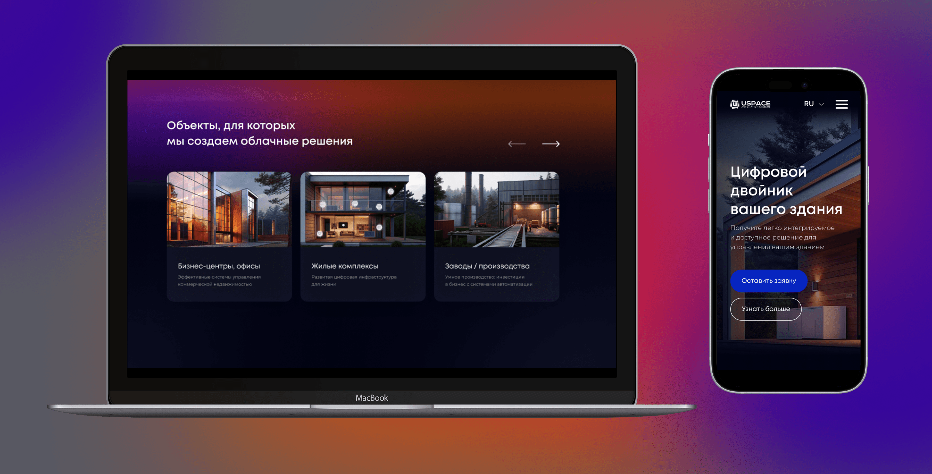 Логика «от ценности к деталям»: первый экран про «цифровой двойник» и ключевые выгоды; далее — сценарии применения (проектирование, строительство, эксплуатация), кратко о IoT/облаке и безопасности (шифрование, 2FA), экономический эффект (снижение энергозатрат и расходов на обслуживание). Показаны линейка устройств/контроллеров и мобильное управление, есть кейсы и отзывы. Графитовый тёмный фон в сочетании с яркими акцентами и белым текстом поддерживает технологичный тон, усиливает контраст и восприятие данных, а также удерживает фокус на CTA. Завершение — форма на демо/30‑дневный тест; на мобильных — упрощённая навигация и прямые CTA ускоряют запуск пилота.