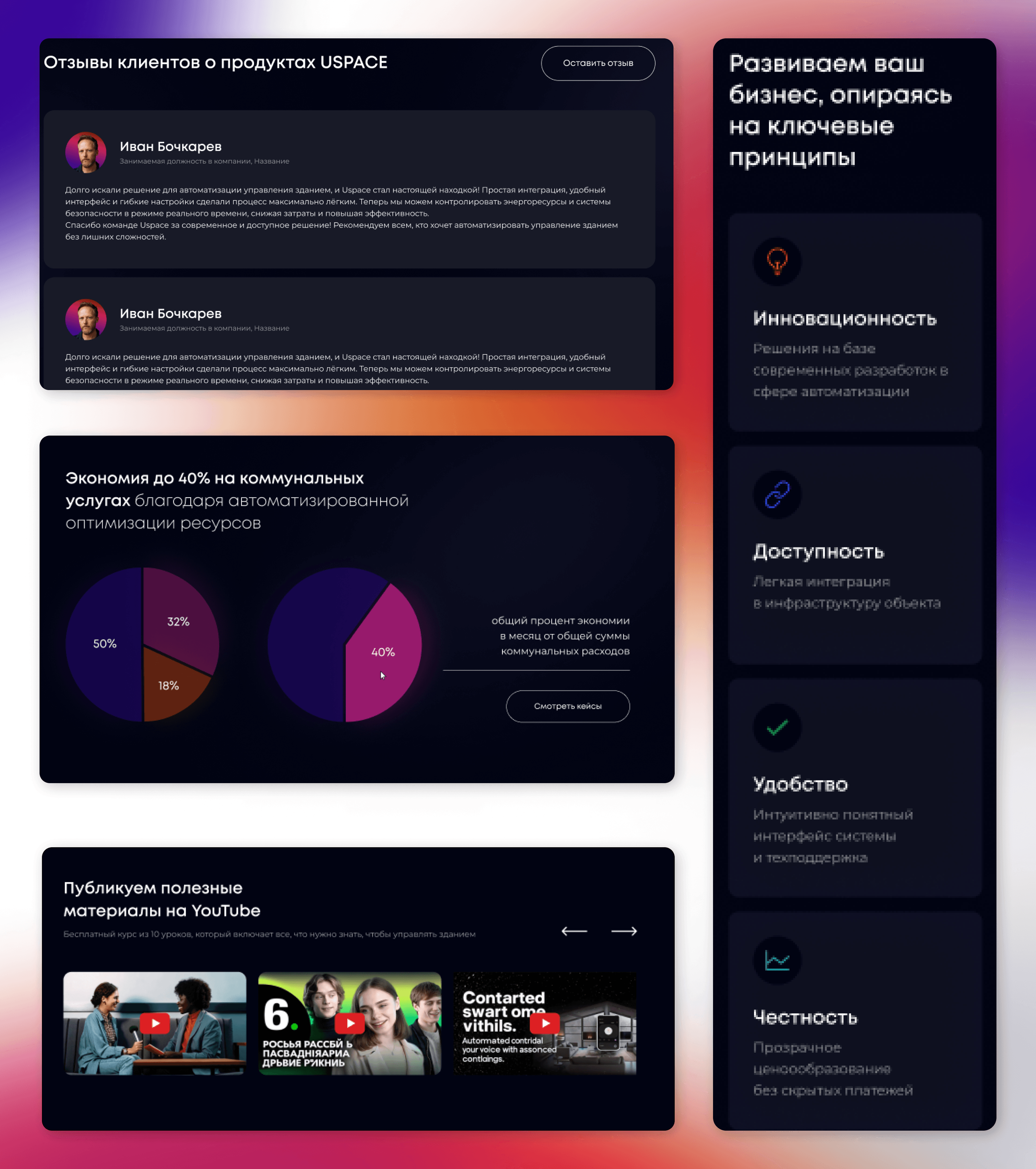 Продающие тексты: Написали тексты в деловом, но ясном стиле, без воды и сложного жаргона. Сфокусировались на выгодах, а не на features.