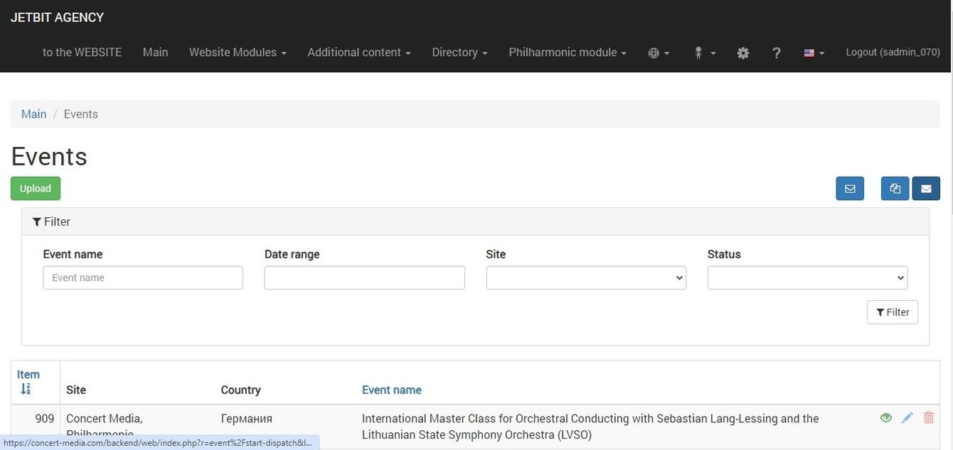 Для удобного заполнения событий была создана административная панель со справочниками артистов, концертных залов, локациями, произведениями на четырех языках ( английский, французский, немецкий и русский для удобного управления менеджерами из разных стран и для независимого наполнения событий и страниц на разных языках.