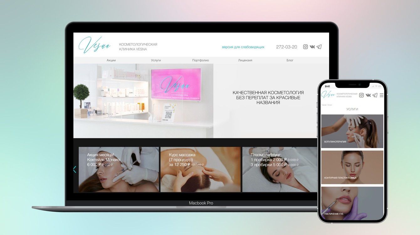 Сайт был разработан в сжатые сроки, оптимизирован для работы на экранах с разными разрешениями, а также было проведено обучение сотрудников клиники по управлению контентом сайта.