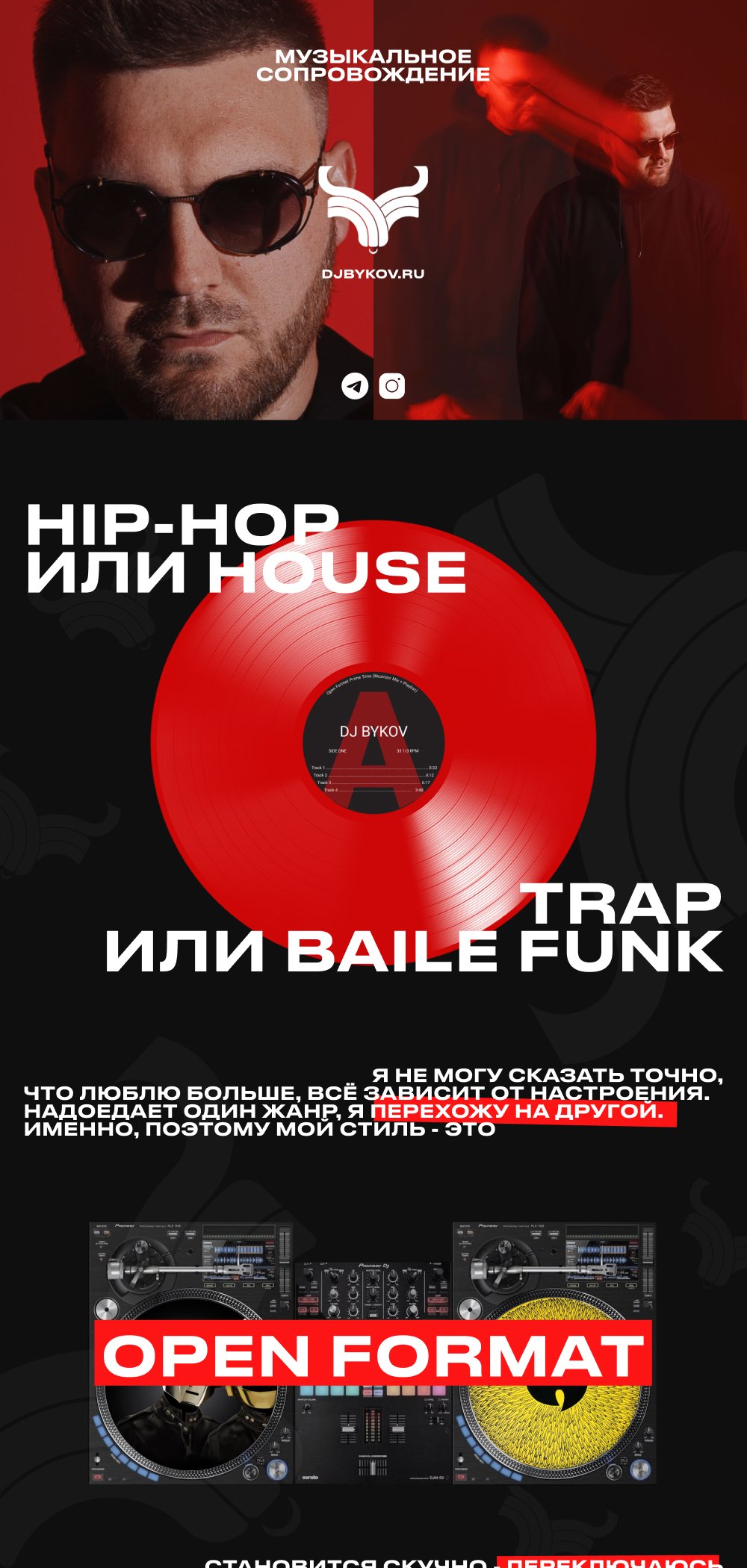 Мы создали стильный, динамичный сайт, отражающий атмосферу выступлений DJ Bykov. Основные акценты — минималистичный, но яркий дизайн, удобная структура и контент, передающий энергетику музыки.