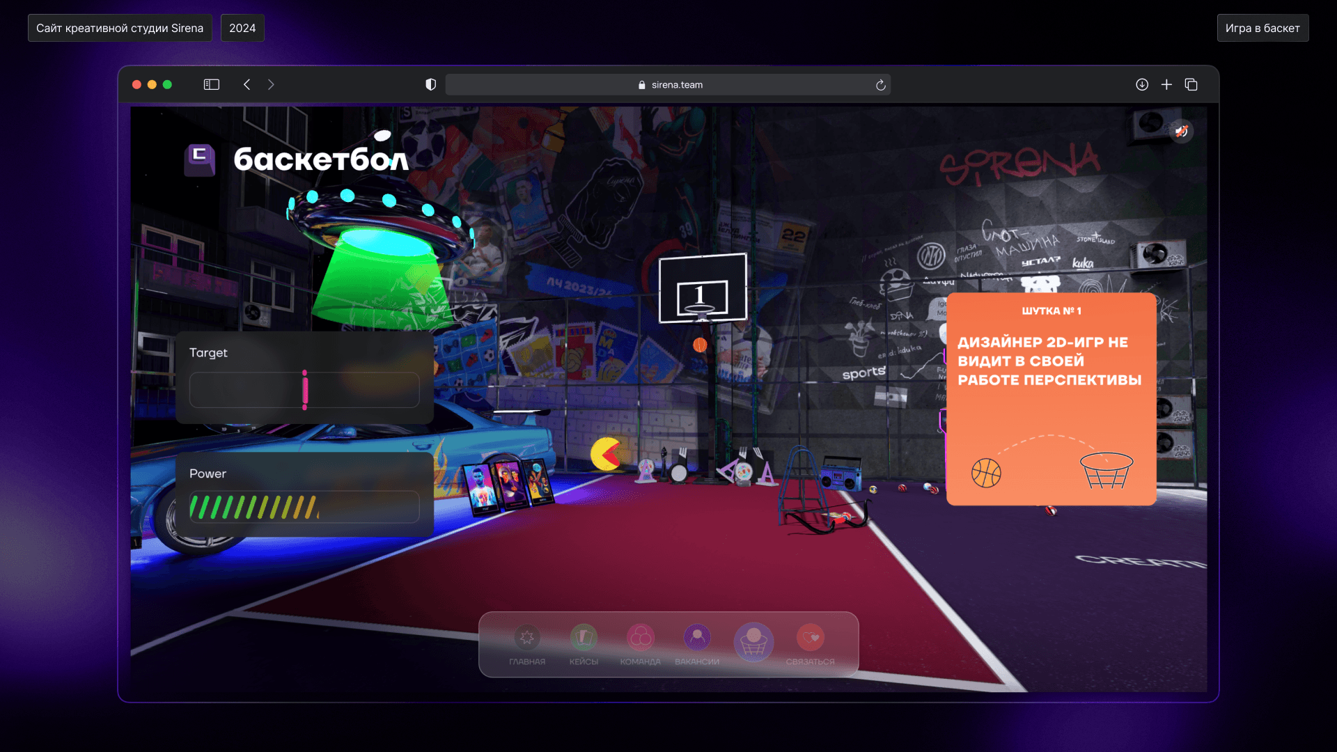 Навигация по сайту тоже со смыслом. Например, кейсы можно посмотреть на игровом автомате, который мы периодически выставляем на ивентах. Это прямая ассоциация с играми, ведь большинство наших специальных проектов с игровой механикой. Нажимая на блок «вакансии», вы переходите на доску объявлений. Есть раздел, где каждый сотрудник оставил собственный тег. Еще одной фишкой сайта стал баскетбол с анекдотами: захотелось создать какой-то прикольный способ отвлечься.