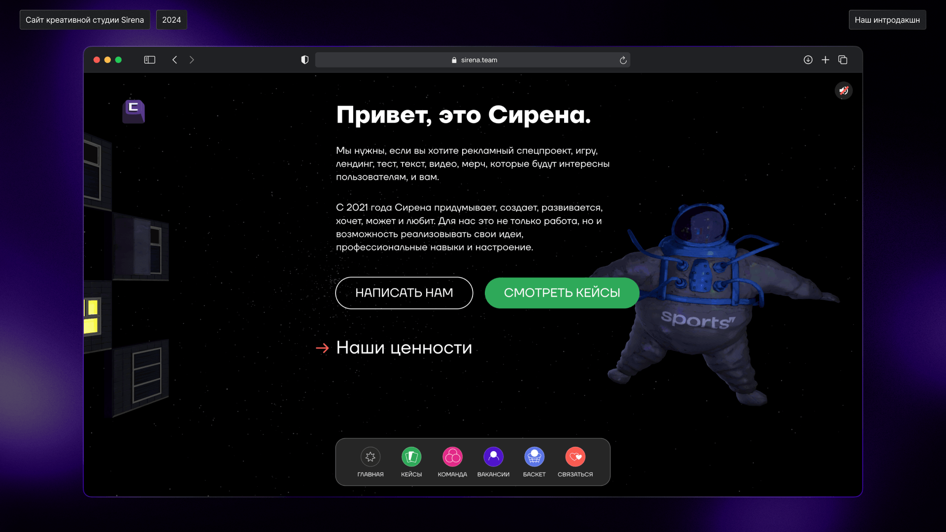 Мы любим наш сайт, честно. Он отражает нас и нашу работу. Внутри него много интерактива: от баскетбола до простого взаимодействия с элементами. Различные элементы, приколы, отсылки, что свойственно креативной студии. Но еще это большой эксперимент, который удался. После него мы стали чаще реализовывать подобные проекты, желая сделать наш web еще интереснее и красивее.
