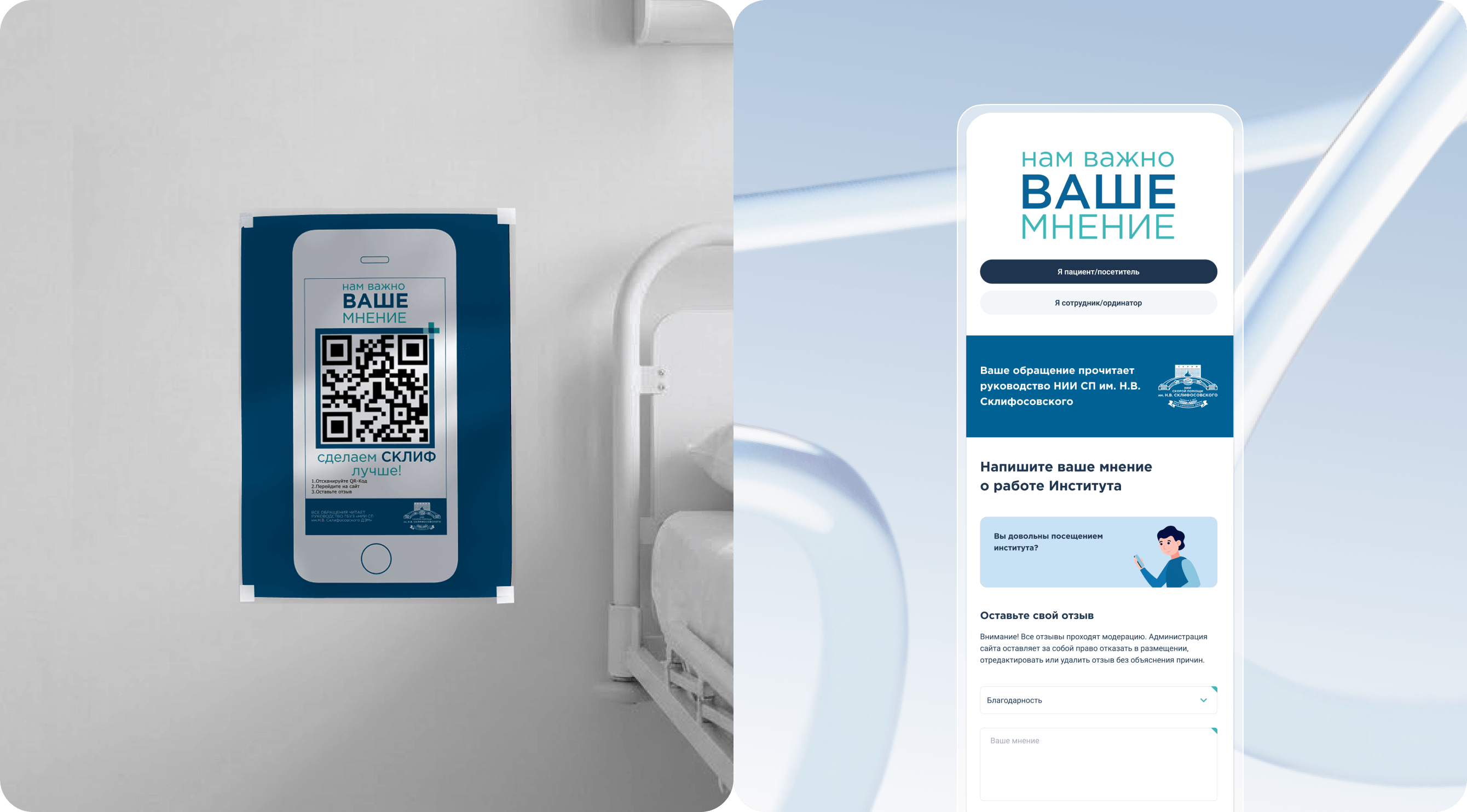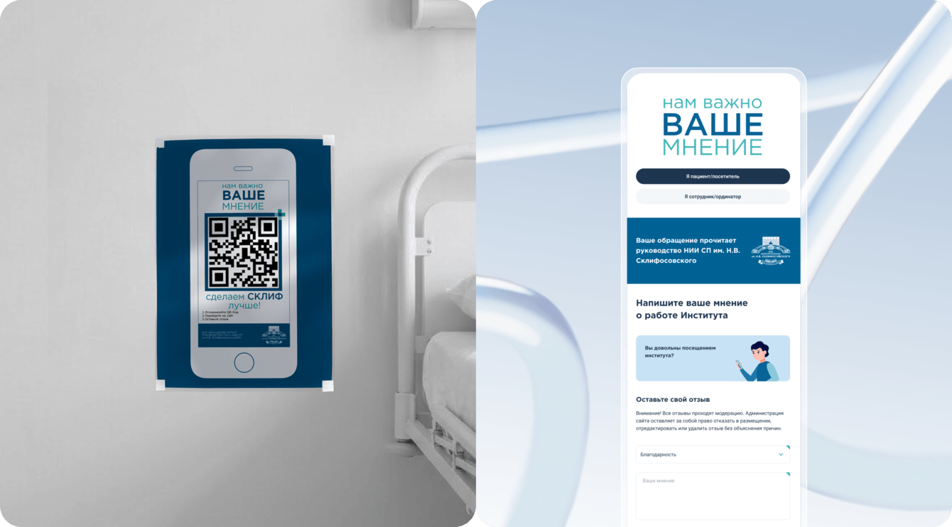 Сделали форму обратной связи, доступную по QR‑кодам в палатах и на постах: пациенты и сотрудники анонимно оставляют оценки, жалобы и благодарности.