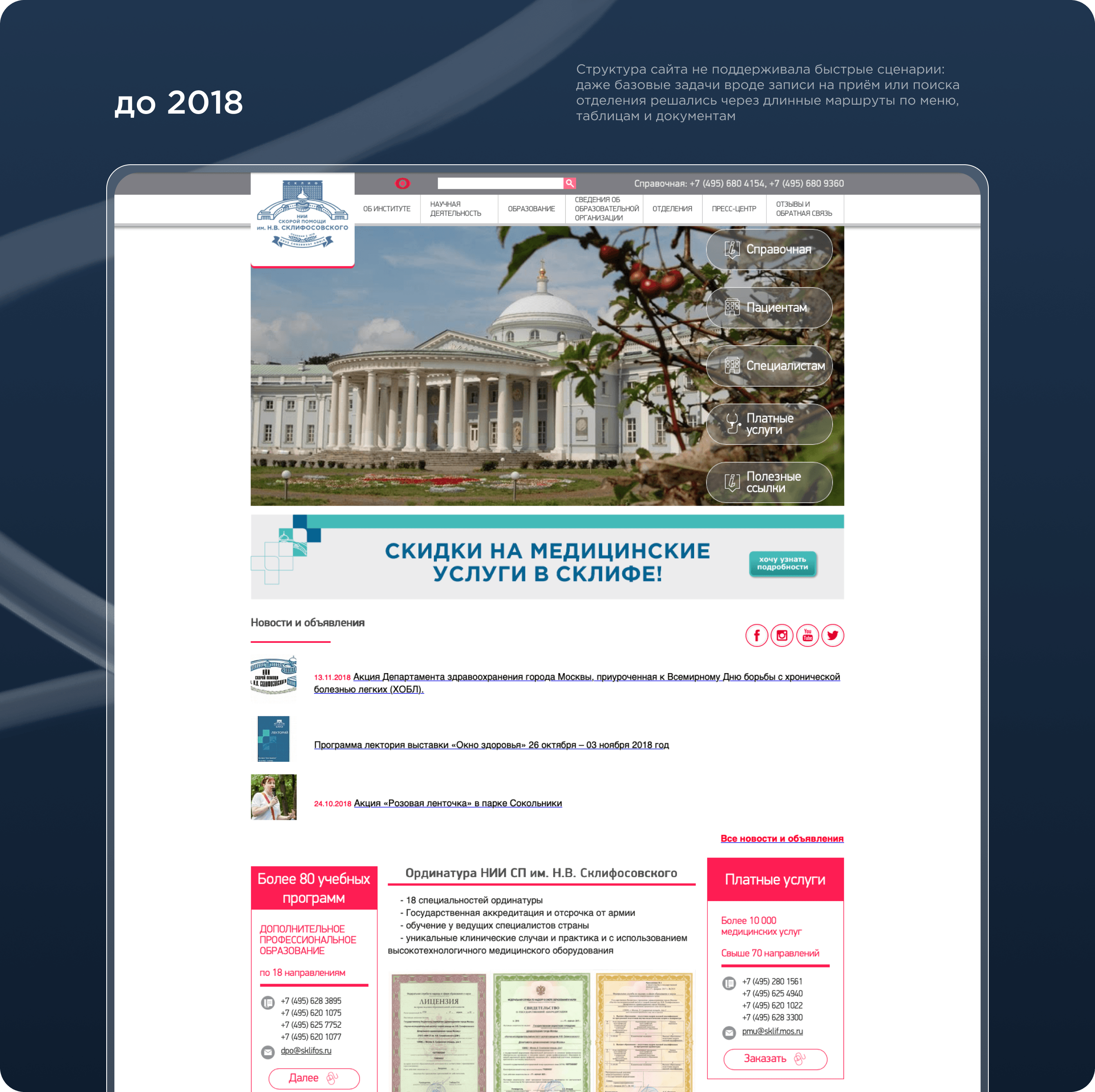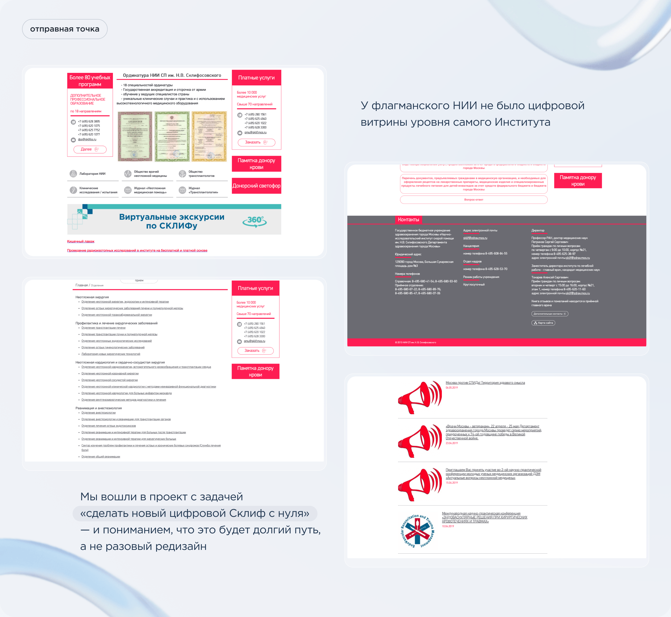 Когда мы познакомились со Склифом, у Института был сайт, который не соответствовал статусу ведущего в России научно‑медицинского центра с 210‑летней историей и требованиям к современным государственным медицинским, образовательным организациям.